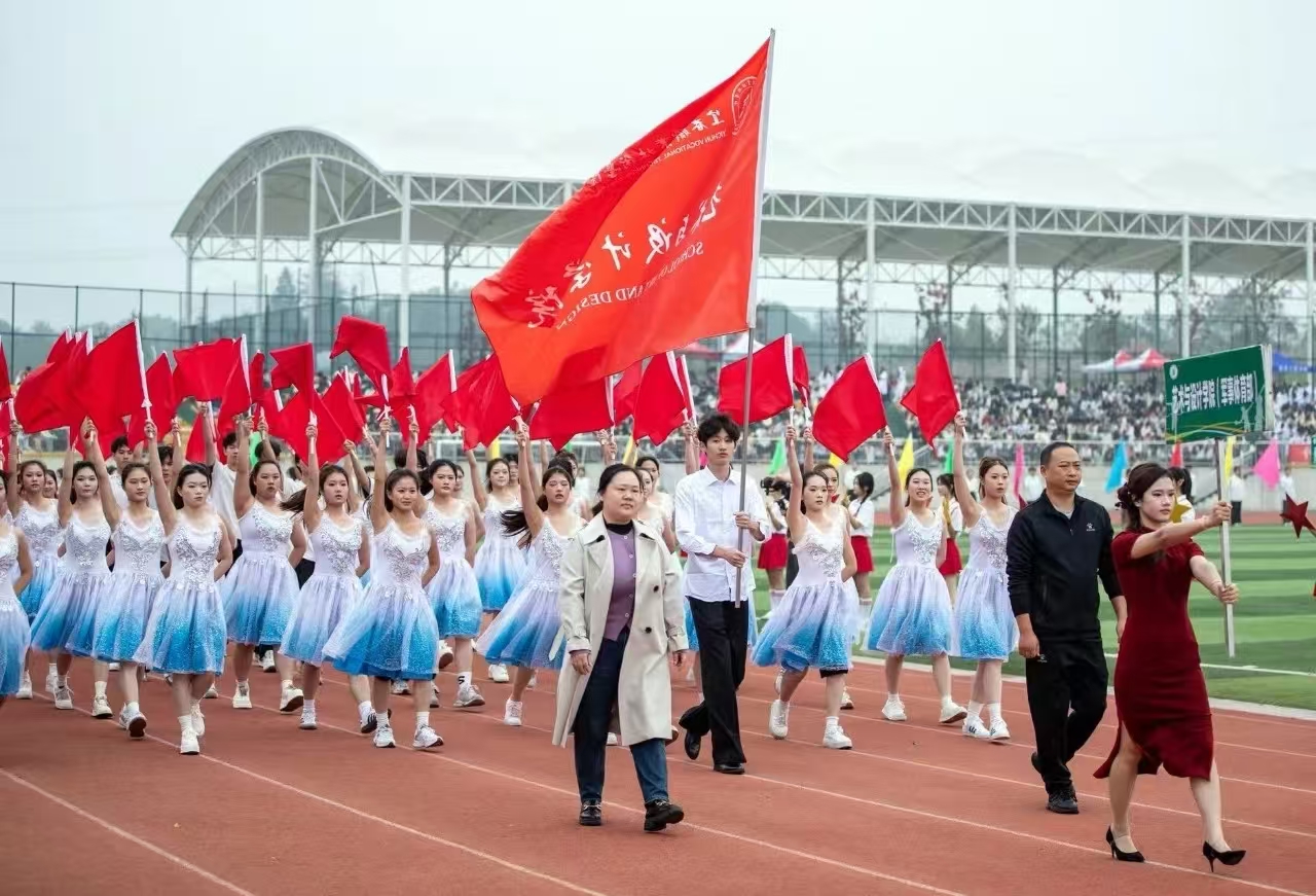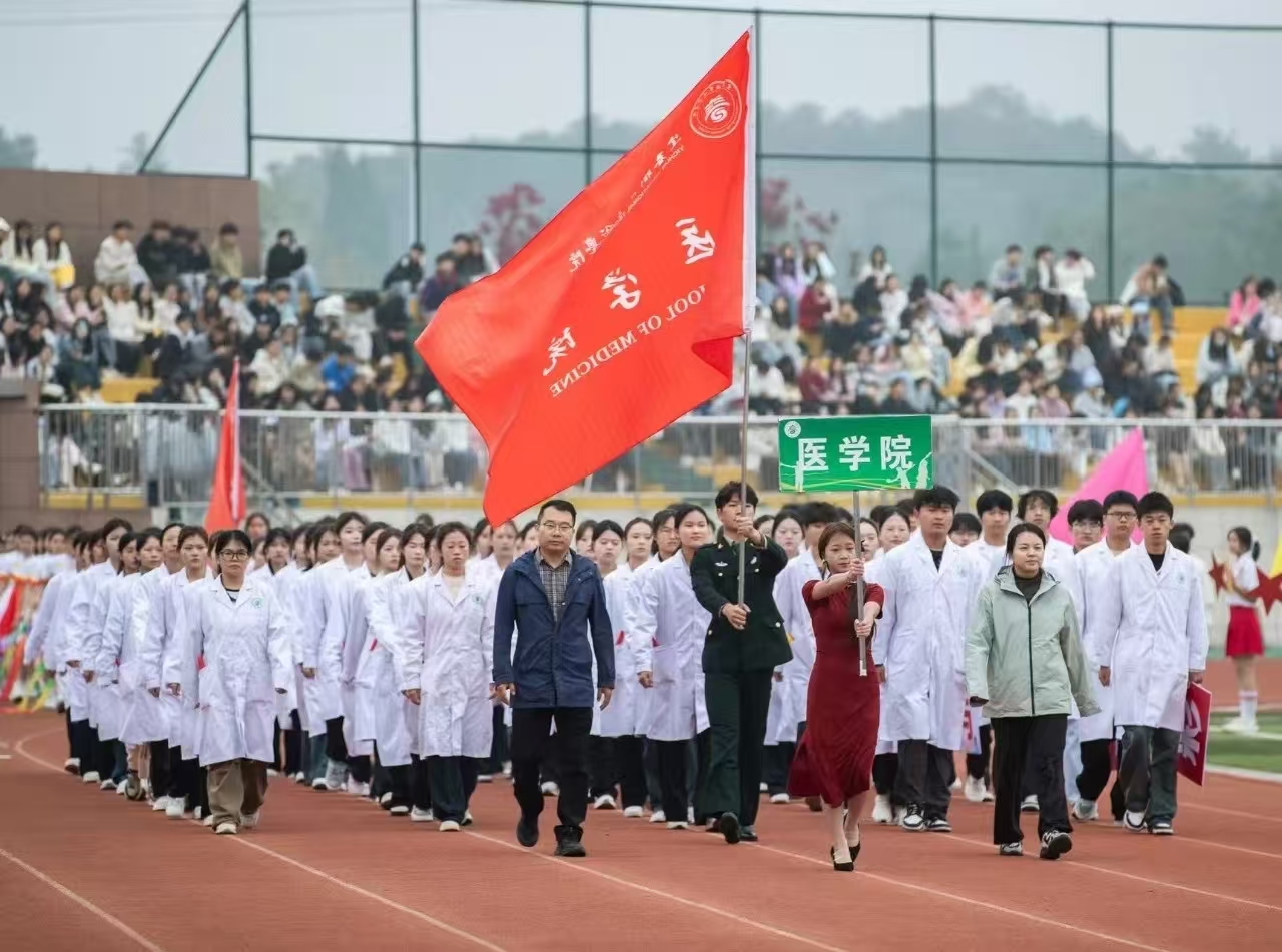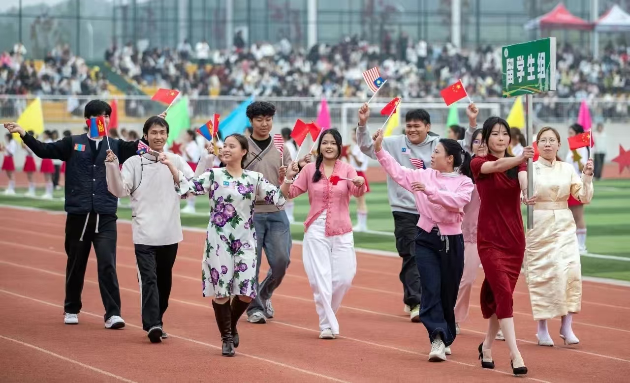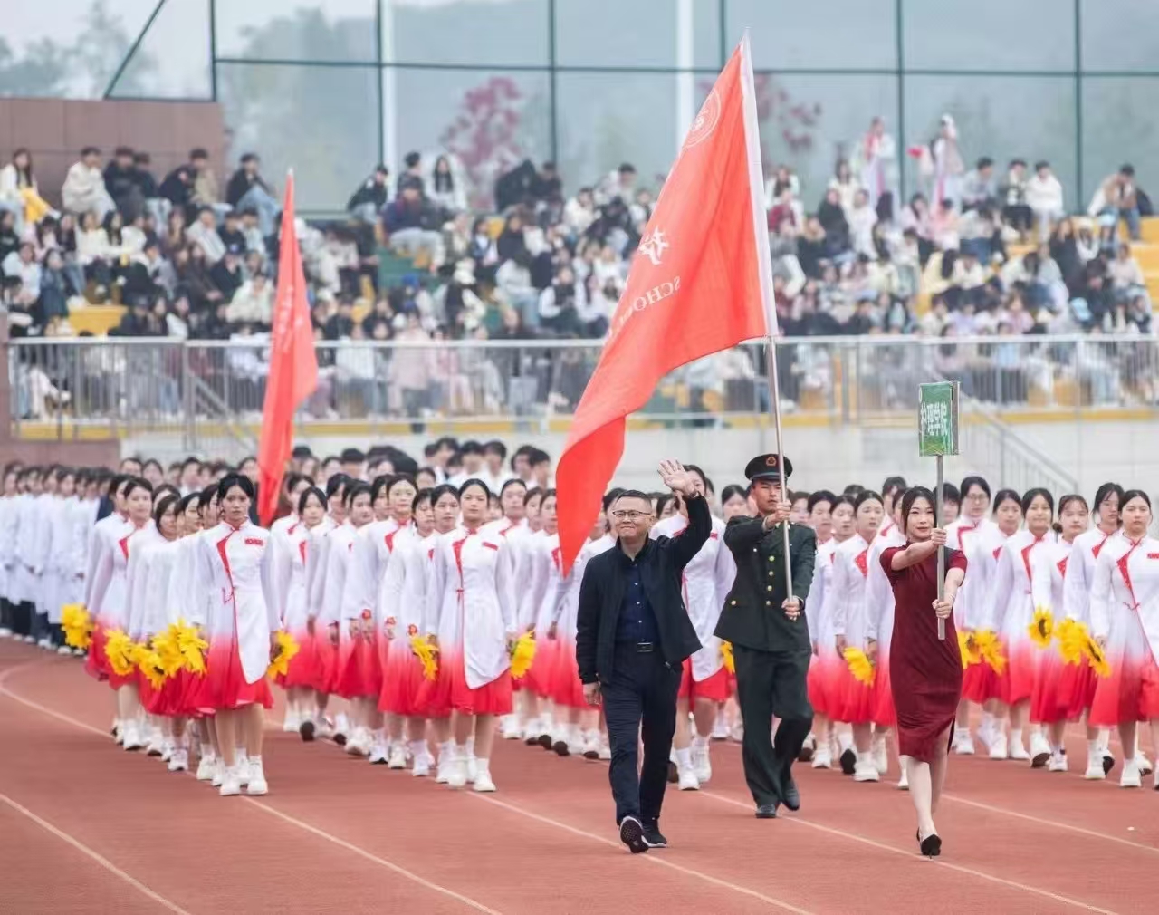 各学院方阵以多样风采绚丽登场。护理学院代表队手持向日葵,在场中巧妙变换出爱心形状,用温暖意象诠释白衣天使以爱守护生命的坚定誓言;师范学院方阵中,绚丽的彩带随舞姿飞扬流转,交织出激情、缤纷的青春图景;艺术与设计学院代表队身着蓝白渐变长裙,步履轻盈,在翻飞的红旗间跃动起舞,尽显艺术气质与蓬勃朝气……其余学院方阵也各具特色,或身披白大褂诠释医者仁心,或身着迷彩服尽显飒爽英姿,或挥动彩扇、红旗,共绘新时代青年学子的昂扬风貌。由马来西亚、蒙古国的留学生组成的方阵首次登场,成为开幕式上一道亮丽的风景线,书写出“技能无国界,文化共交融”的生动篇章。