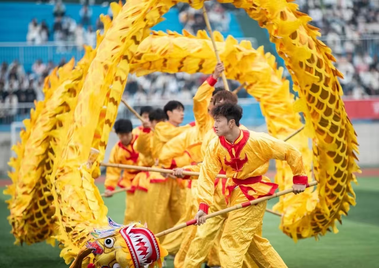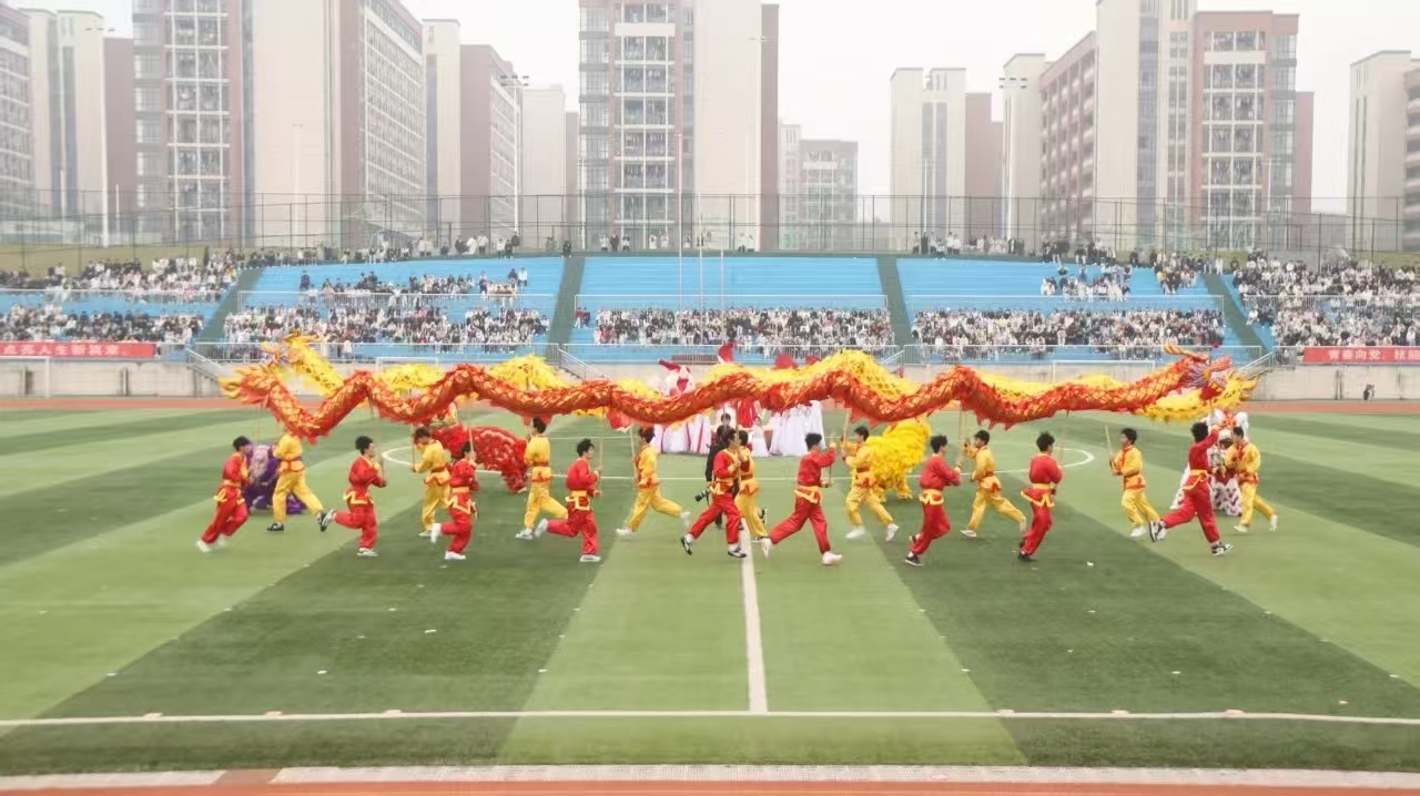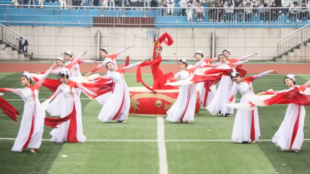 开幕式文艺表演精彩启幕。护理学院带来的啦啦操《青春向未来》以动感的舞步点燃赛场,五色跃动的身影勾勒出青春最美的模样。信息工程学院与师范学院联袂呈现的节目《薪火耀山河》,在两名少先队员清澈的童声中,演员们以红旗、红扇与红星伞为媒,聚似烈火、散若繁星,薪火在流动的红色中传承不息。医学院带来的韵律操《最好的舞台》,节奏明快、动感整齐,每一拍律动都活力满格。艺术与设计学院带来表演《盛世中华》,激昂欢悦的鼓点中,金龙雄狮欢腾跃动,水袖翩翩迎风舒展,中华优秀传统文化的深厚底蕴与宜职昂扬向上的时代风采交相辉映。