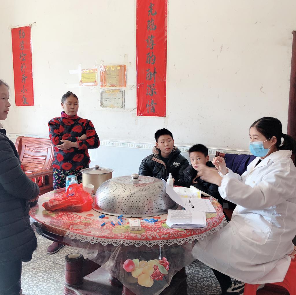 另外,黄敏同学每天下乡为村民测量体温,登记情况,做好防护宣传,督促好群众做好自我保护工作,她负责测量万载县潭埠镇昌集村95户,400多人的体温测量,为期14天;杨益冬同学从2月4日起,每天在丰城市拖船镇后村卫生所为村民测量体温;邱胜男同学每天坚守村卫生所,为村民提供医疗帮助。在农村防护条件相对较弱,大家的防护措施只有一个口罩,同学们笑称“一个口罩打天下”。