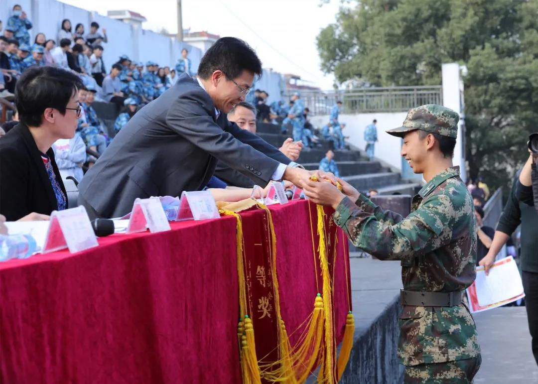 接着,刘军宣读了2020级新生军训会操比赛获奖名单,杨云山为96735部队授旗,学校领导为各获奖连队教官颁奖。