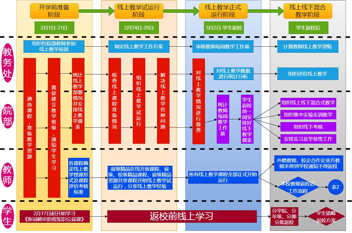 疫情发生以来,教育部、省教育厅对各级各类学校开学时间作出了明确的部署,省教育厅要求全省学校不得早于3月1日开学。教务工作组根据上级教育行政部门要求,制定了教务工作组疫情防控应急工作预案,成立由分管教学副校长任组长,教务处、学工处、实习就业处负责人任副组长,各学院、部主要负责人和教务处成员任组员的专项工作组。工作组将疫情期间教务工作分为开学前、线上教学试运行、线上教学正式运行、线上线下混合教学四个阶段,明确了每个阶段的时间节点及工作任务,要求各教学院部精准摸排任课教师疫情,下达教学任务,组织建设线上教学资源,安排学生线上学习,稳步推进停课不停学、不停教。