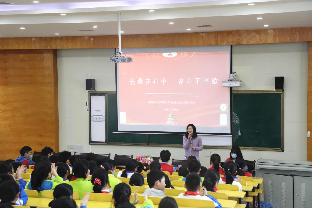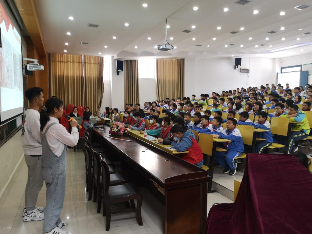 党史宣讲小分队的同学们讲述了“满门八英烈,信仰高于天”、幼时壮烈牺牲的小虎子、藏在墙缝里的遗书、朱德的扁担、“中国导弹之父”钱学森等红色故事……,“红领巾”们认真聆听,参与互动,积极回答问题,现场气氛热烈。台上深情并茂,抑扬顿挫的话语,激发了“红领巾”们对革命烈士的敬仰之情,自豪感和敬畏感油然而生。最后全场高声齐唱歌曲《我和我的祖国》将本次活动推向高潮。