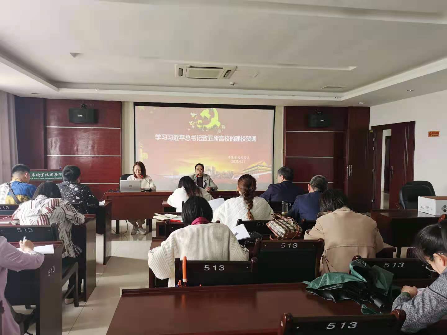 本站讯(师范学院党总支 席睿琪)2021年4月27日下午,师范学院党总支组织全体党员在科技综合楼513会议室开展了党员学习活动。学习活动之前,师范学院党总支给每位党员发放了专门印制的《党史学习教育笔记本》,学习委员席睿琪带领大家重点学习了习近平总书记致清华大学、中国人民大学、西藏民族大学、哈尔滨工业大学、厦门大学的建校周年贺词,同志们认真听讲,用心做学习笔记。