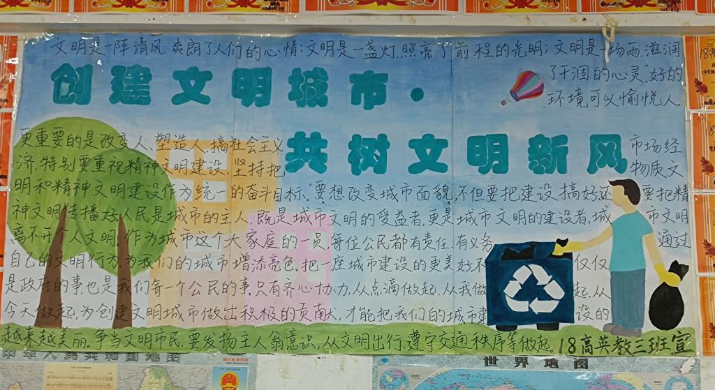 各班级经过几周的精心准备,每一幅板报都主题突出,内容丰富,设计新颖,布局合理,色彩搭配明亮和谐。从文章选取到美术设计,从绘画涂色到剪贴排版,全都体现了大家对此次板报比赛的重视。设计美观、形式多样的板报,表达了同学们对创建文明城市能够取得更大进步的美好愿望。经过评比,英语教育18503班荣获此次活动的一等奖。
