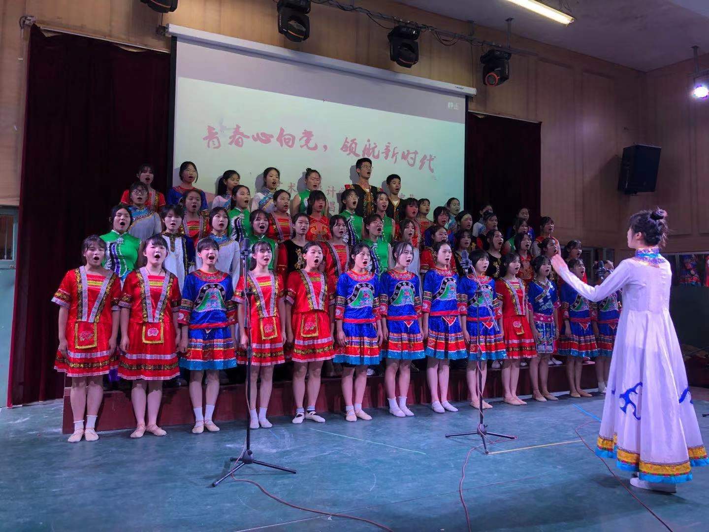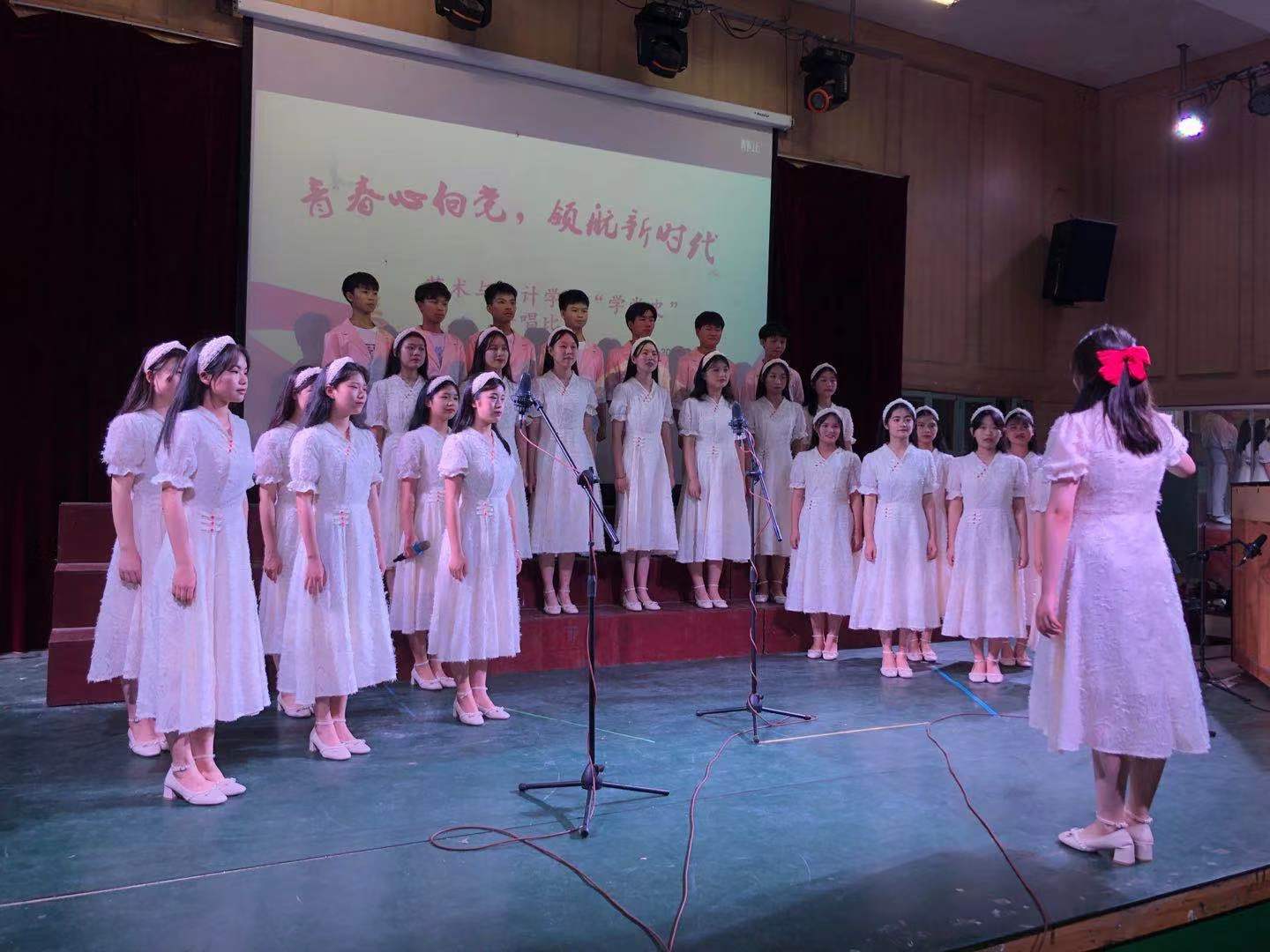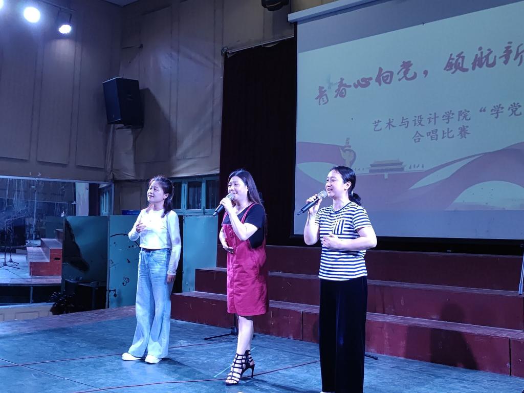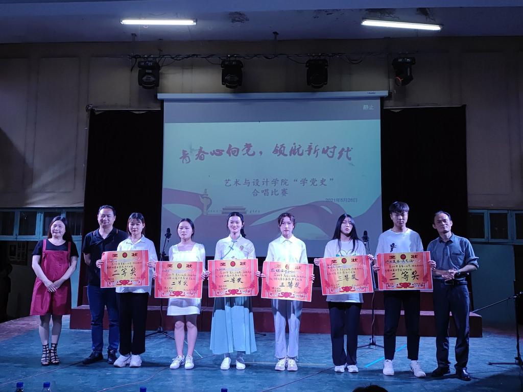 伴随着主持人热情洋溢的开场,合唱比赛正式开始。本次大赛分专业组和非专业组,非专业组带来指定曲目《唱支山歌给党听》,每个班级用独具匠心的唱法和指挥,气势磅礴的歌声与旋律歌颂了中华民族自强不息的伟大精神。专业组班级依次演唱,《爱我中华》、《七子之歌》、《我的祖国》《灯火里的中国》…一首首脍炙人口的经典歌曲,唱出对党、对祖国的无限深情。经过评委的公正评分,最终角逐出专业组和非专业组的一、二、三等奖。艺术与设计学院副院长付菲对各班的表演进行了专业点评,党总支书记罗平对学生们利用课余时间排练歌曲付出的辛苦给予高度评价,同时对获奖班级提出了更高的要求。最后,由三位老师带领全体同学一齐演唱《唱支山歌给党听》,比赛在慷慨激昂的歌声中拉下帷幕。