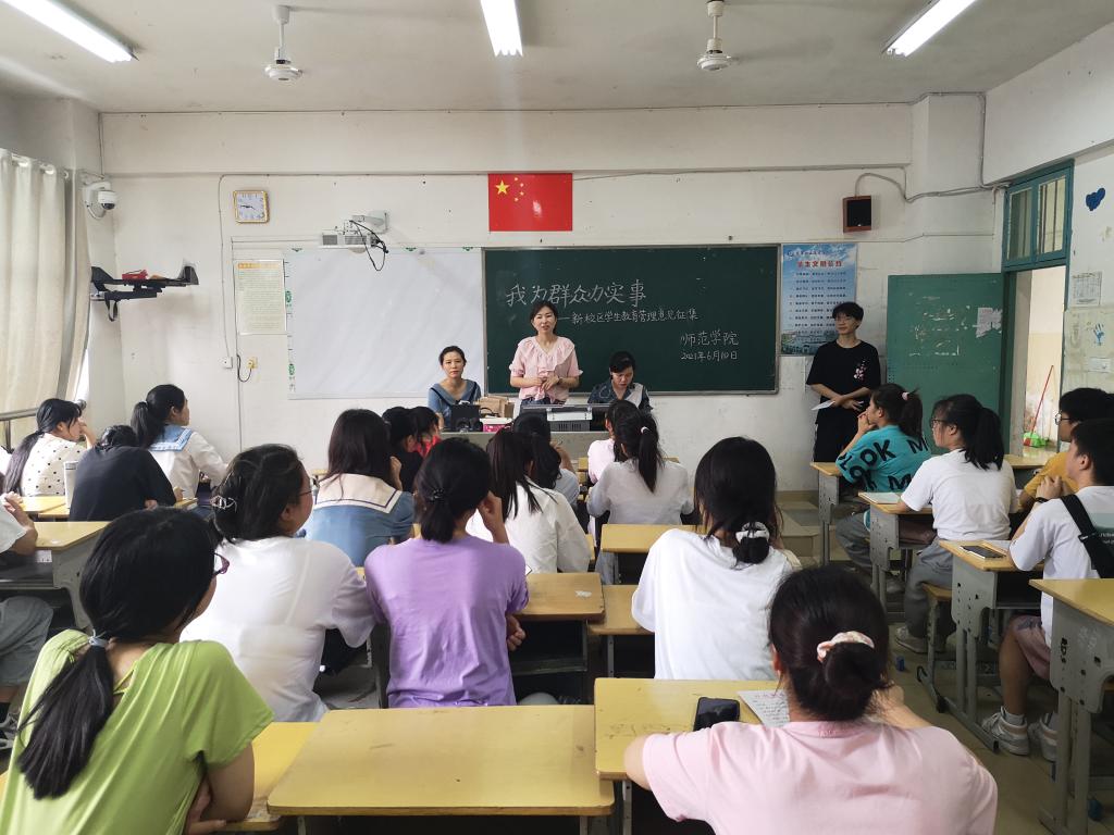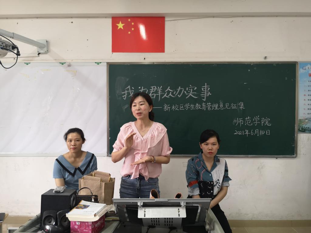 本站讯(师范学院 刘杰)为更好地谋划新校区工作,提升学生教育管理水平,了解学生的学习和生活,听取学生对新校区教育教学和学生管理的意见建议。师范学院于6月10日下午在一教D301教室召开“我为群众办实事——新校区学生教育管理意见征集座谈会”。师范学院教务科科长任玉慧、学工科辅导员孙平、刘杰,以及所有在校班级学生代表40余人参加了此次会议。座谈会由团总支书记杨文姝主持。