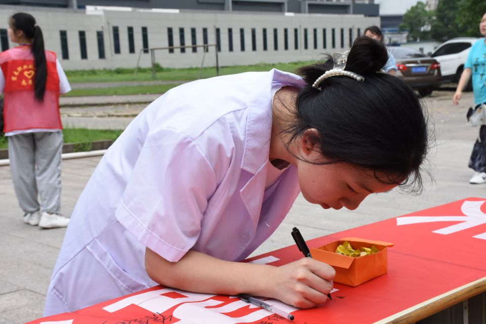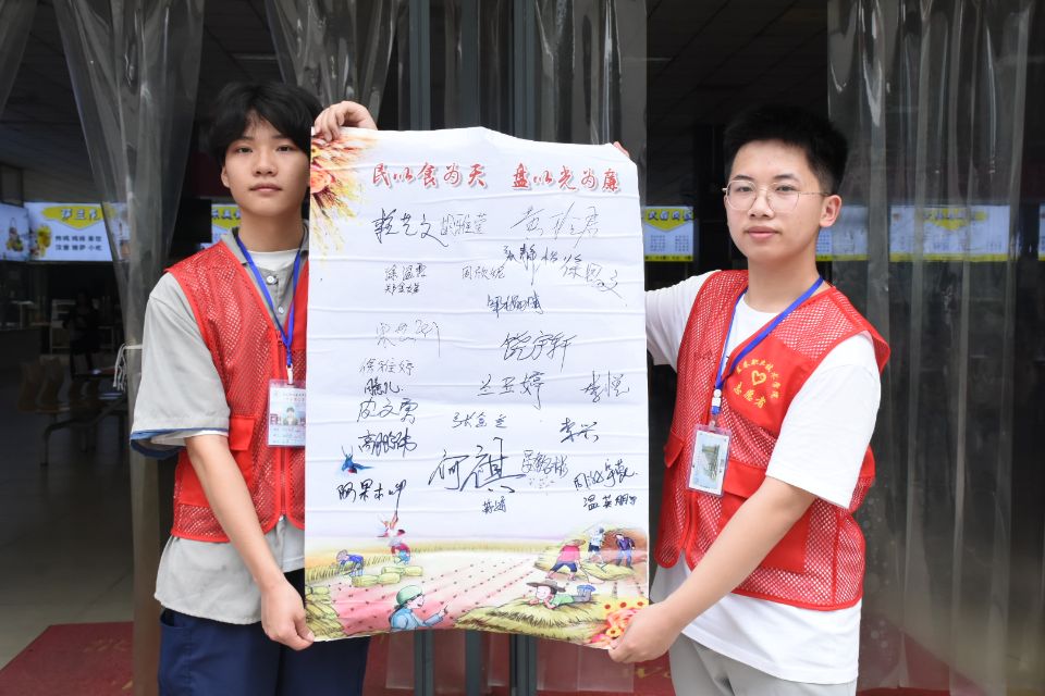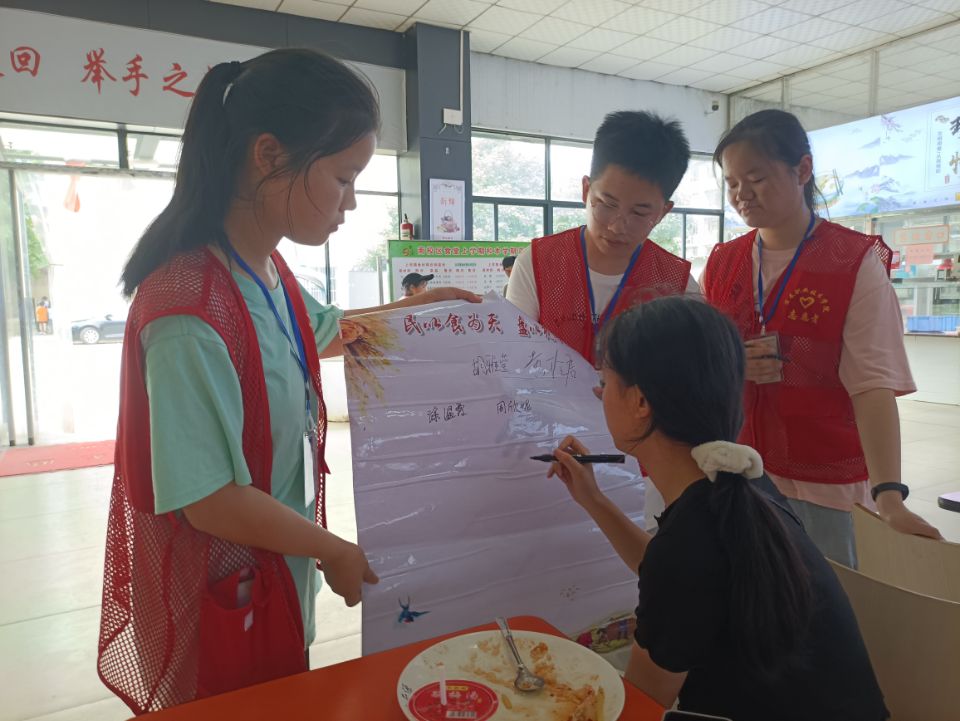 在场的同学们纷纷参与到活动中来,在宣传横幅及海报上签下自己的名字,并表示将在未来的校园生活中以身作则,做光盘行动的践行者、倡导者。