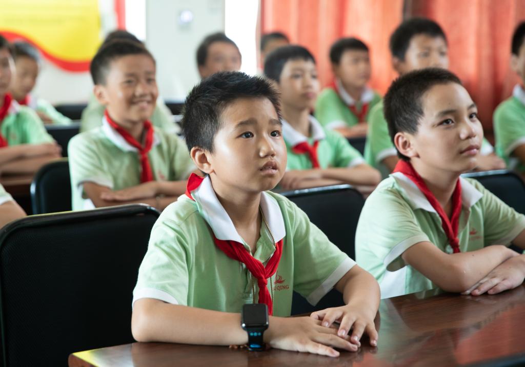 来到综合楼党员活动室,五(1)班的几十名孩子穿着整齐的校服,戴着红领巾,等待大家的到来。
