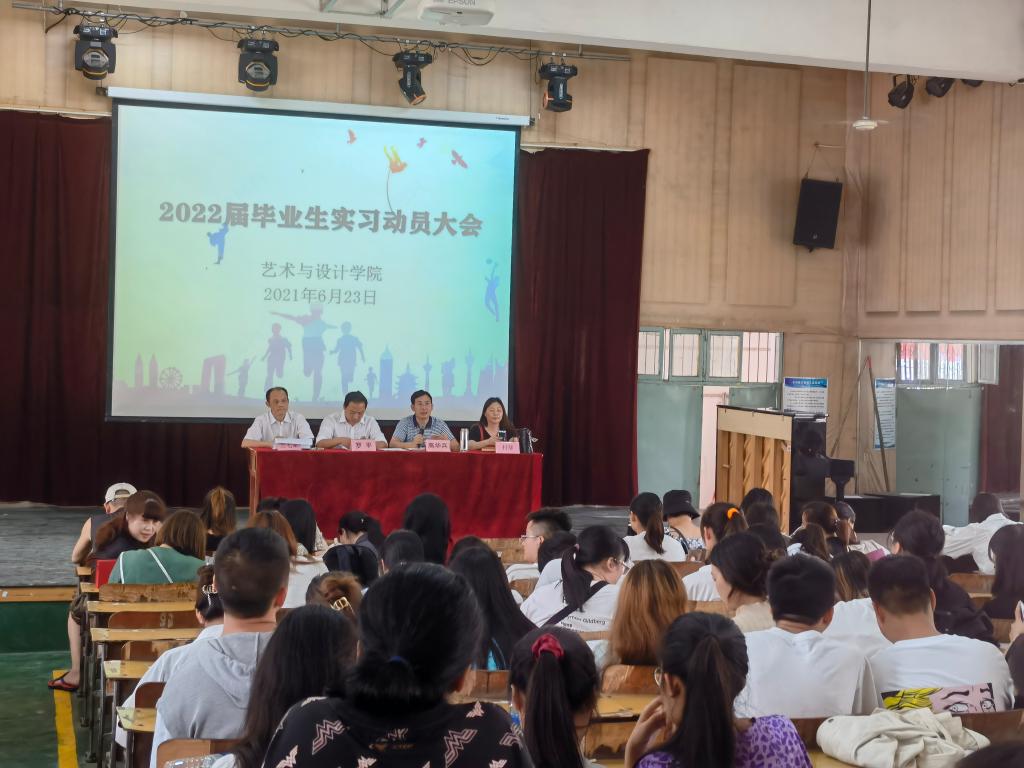 本站讯(艺术与设计学院 雷斯羽)2021年6月23日中午,艺术与设计学院在科技楼阶梯教室召开2022届毕业生实习动员大会。艺术与设计学院院长高华兵、党总支书记罗平、副院长付菲、党总支副书记兰七荣、全体实习指导老师及全体实习生出席了本次会议,会议由辅导员雷斯羽主持。