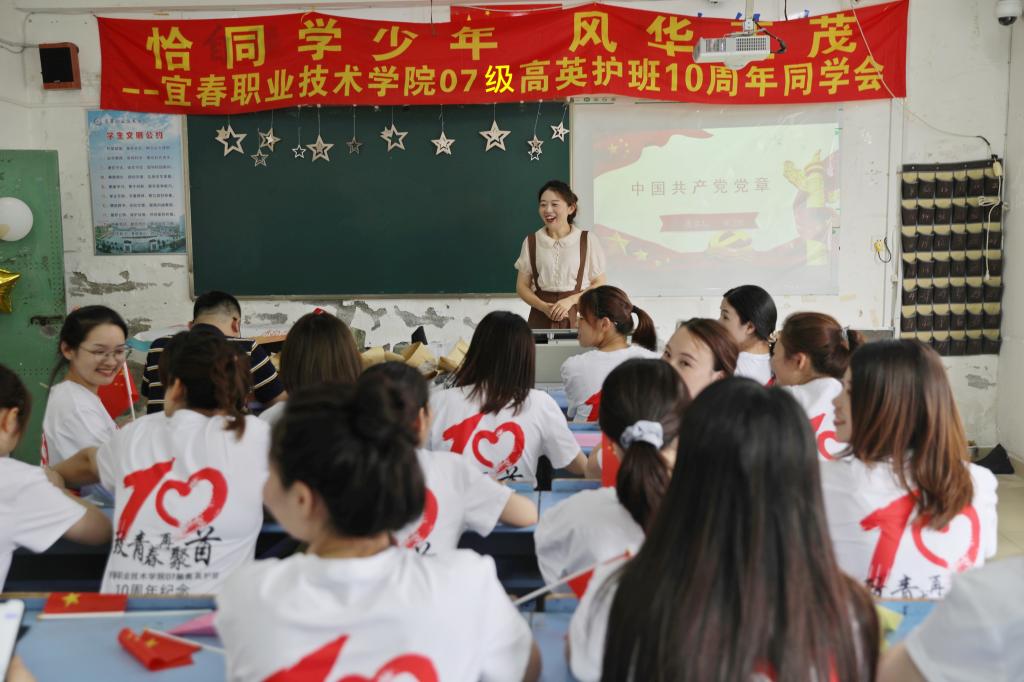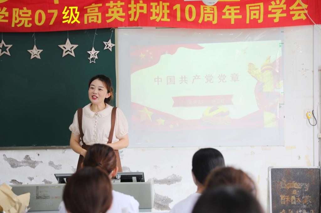 本站讯(国际教育学院 徐卫红)为深入学习、贯彻落实习近平总书记在党史学习教育动员大会上的重要精神和指示,引导广大毕业生“守初心、铭使命、真实干”,以昂扬的精神面貌庆祝建党一百周年,7月17日上午,国际教育学院党员徐卫红在一教楼西604为自己的第一届学生——07高英护班返校庆祝毕业十年的学生,上了一堂生动难忘的党课。