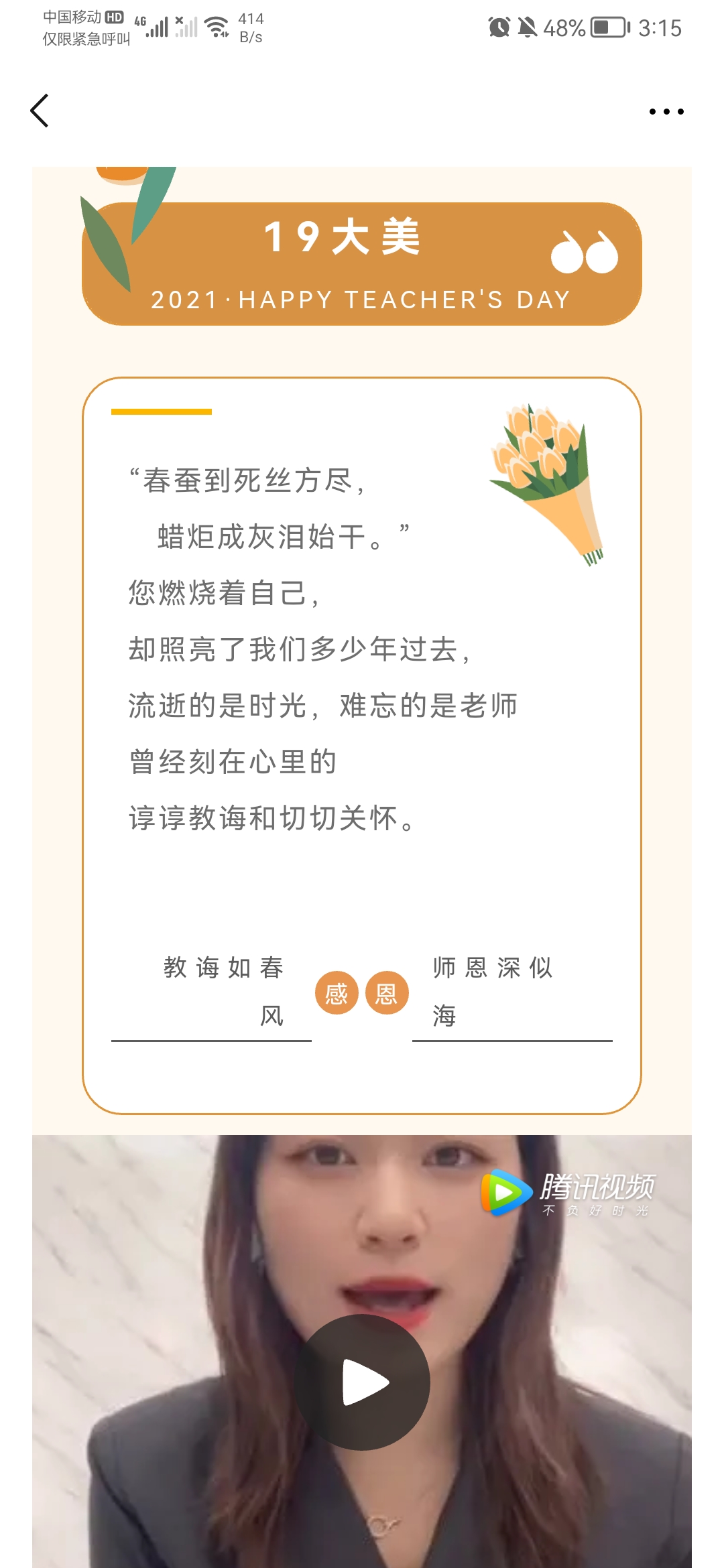 9月初在学生中发起了“老师,我想对您说”的活动。同学们纷纷通过视频、三行诗等形式向老师传达敬意,作品精彩纷呈。通过挑选后将优秀作品于9月10日在医学院公众号发布,获得了老师、学生及学生家长的好评。