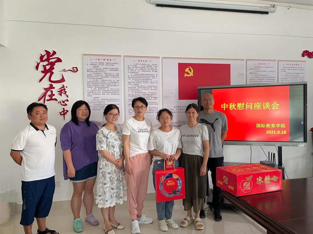 本站讯(国际教育学院 金岩)为积极响应习近平总书记关于爱国主义的重要论述,感受浓浓的爱国主义情怀,唱响中国传统文化主旋律,9月18日上午,国际教育学院在党员活动室401开展中秋慰问座谈会。座谈会由党总副支书记杨敏主持。校党委委员刘江毅副校长、我院领导班子成员以及相关班主任和慰问同学参加了座谈。