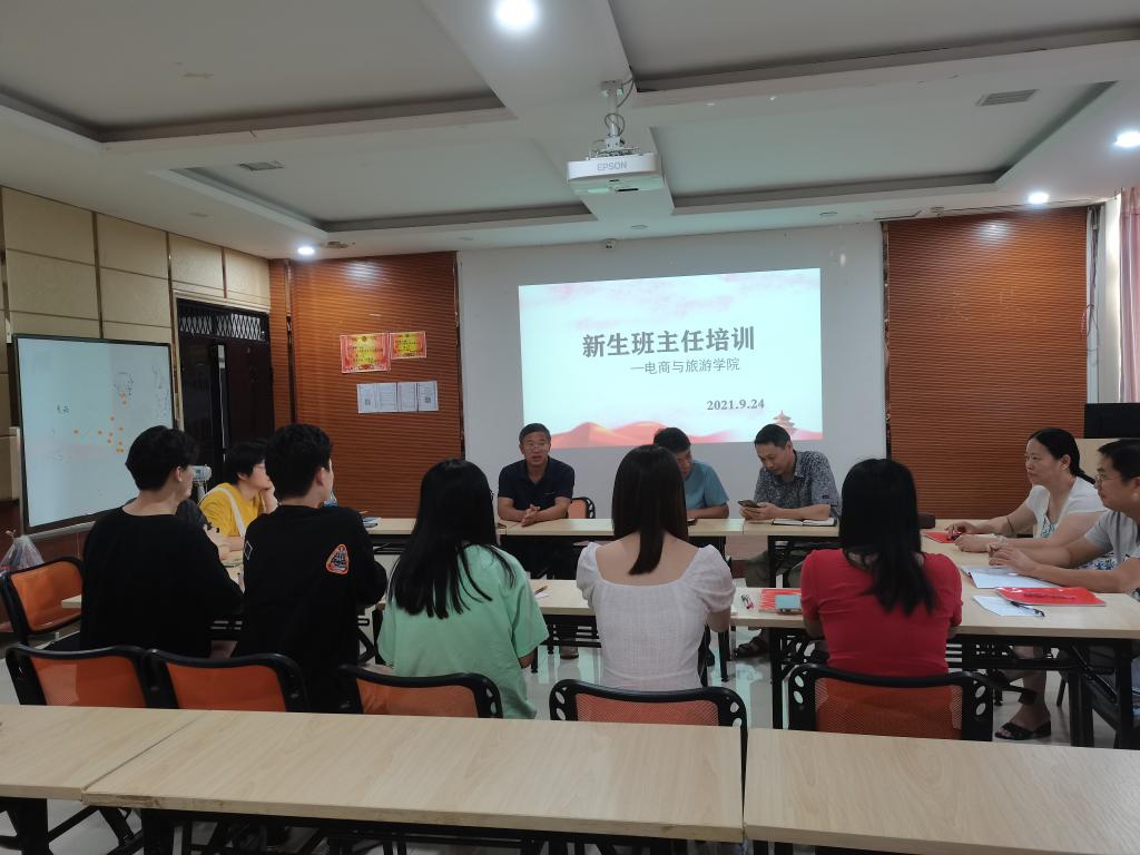 本站讯(电商与旅游学院 马思源)2021年9月24日,电商与旅游学院开展了2021年新生班主任培训活动,由党总支副书记陈小保主持,出席活动的有院长陈洪,副院长欧阳晓波,党总支书记谭育林,团总支书记余纷,学工科科长熊园园,辅导员王宁和马思源和新生班主任们。