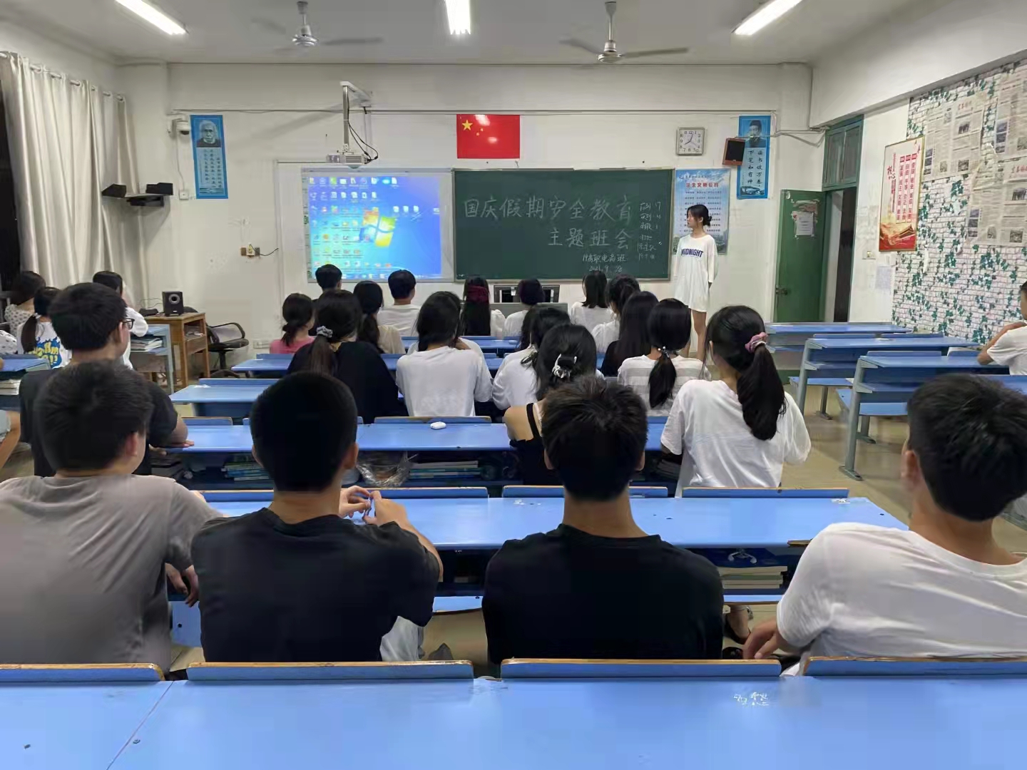 安全第一,预防为主。本次“国庆假期安全教育”主题班会,增强了同学们的安全防范和自我保护意识,为学生们能过一个安全、愉快的国庆假期提供了有效保障,使我院安全教育真正落到实处。