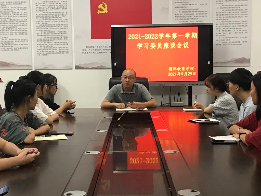 本站讯(国际教育学院 学生记者 何雪琪)新学期开始,为了进一步了解我院学生学习状态,帮助同学们养成良好的学习习惯、营造浓厚的学习风气,国际教育学院于2021年9月29日在科技综合楼401召开了本学期学习委员座谈会。会议由副院长肖勇主持,在校班级学习委员及部分学生代表共15人参加。
