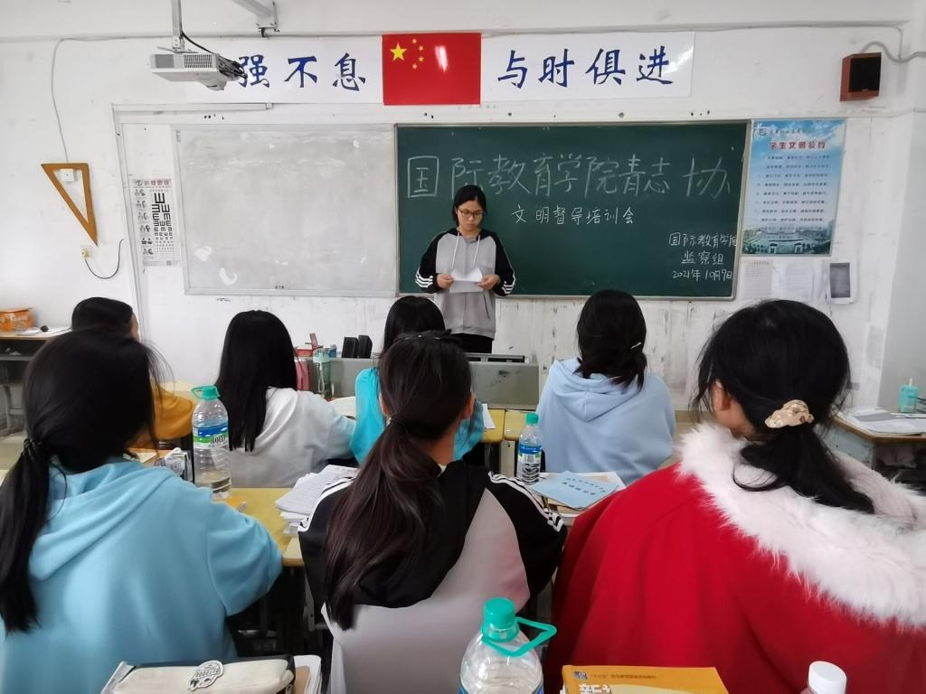 本站讯(国际教育学院 朱媛 学生记者 张梦茜)为了有力推动校园文明建设,国际教育学院于10月9日中午在第一教学楼X401教室对院青志协监察组主要负责人及工作人员进行培训,以改进工作风,改善工作方法,促进文明督导出成效。