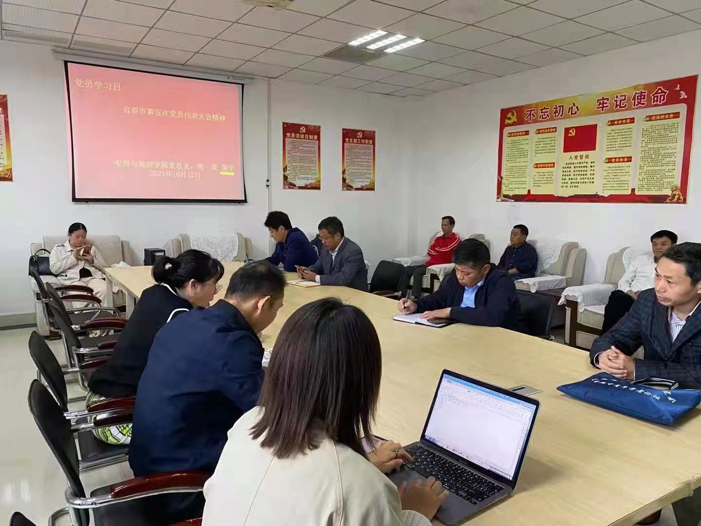 本站讯(电商与旅游学院 马思源)为了深入贯彻落实习近平总书记视察江西重要讲话精神,团结带领广大党员满怀初心和使命,在新征程上奋力出发。2021年10月12日,电商与旅游学院党总支学习宜春市第五次党代会精神“于秀明书记《满怀豪情再出发 担当实干勇当先》的报告”,由熊瑛老师领学,全体党员共同参加。