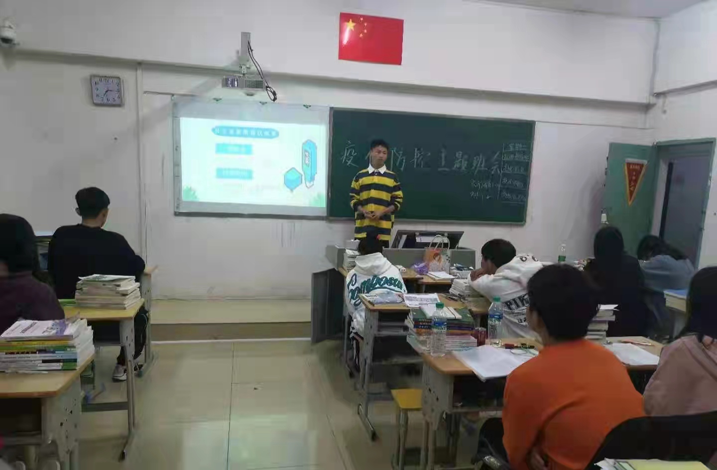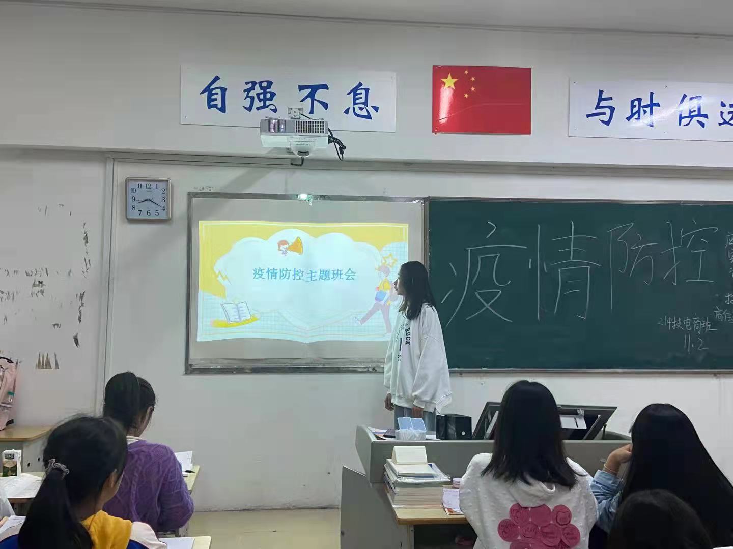 班会开始,各班首先围绕“疫情防控”,向全体同学普及了疫情防控知识以及各类安全知识。其次,强调在封校期间,学生不得私自离开学校,并且要时刻注意疫情防控、做好个人防护,在人员密集的场合要佩戴好口罩,若出现体温异常,要及时上报到班主任。最后,提醒同学们,防疫不放松,要做到科学防护。