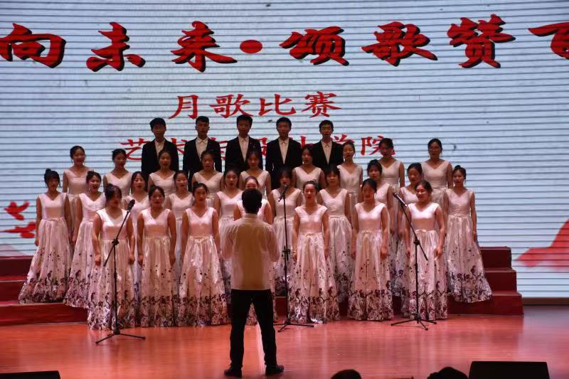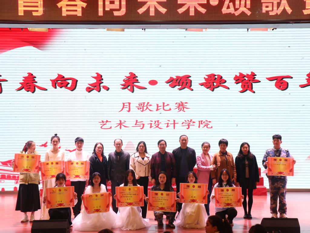 本站讯(艺术与设计学院 学生记者 朱志琪)为弘扬爱国精神,重温红色经典,增强班级凝聚力,丰富校园文化生活。艺术与设计学院于2021年11月9日下午在科技综合楼学术报告厅举行以“青春向未来·颂歌赞百年”为主题的月歌比赛活动。艺术与设计学院院长高华兵、党总支书记罗平、副院长付菲、党总支副书记兰七荣及各位评委老师出席了本次比赛。