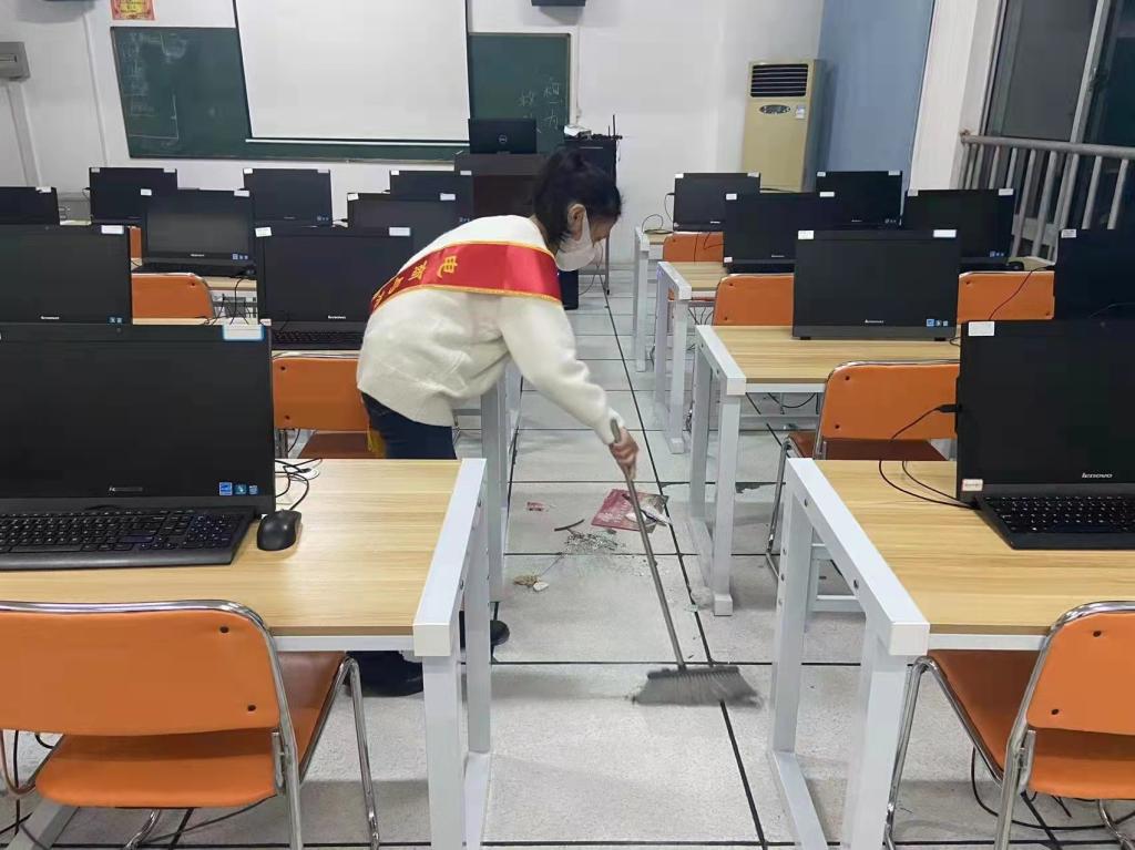 活动中,由负责人分发物资后,志愿者们按照各自划分的区域有序开展教室清扫活动,大家认真地清扫着教室里的角落和摆放各种杂物,仔细擦着桌子架子上的灰尘,教室焕然一新,志愿者们互帮互助,还时不时地传出一阵阵爽朗的笑声…没有一丝懈怠,充分发挥了不怕累,不怕苦的劳动精神。