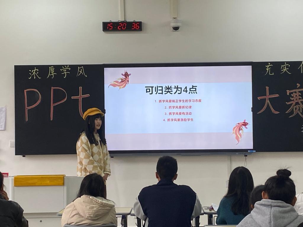 大赛伊始,参赛选手运用文字、图片、背景音乐、视频等依次展示了自己精心制作的PPT作品,同学们紧紧围绕学风的含义、校训的深意以及树立学风等来阐述自己对学风的认识。参赛作品都图文并茂,各具特色,别出心裁,同时又融入了校园文化和各自的不同风格,体现同学们参赛的态度认真积极。经过一番角逐,最终由护理21303班荣获一等奖