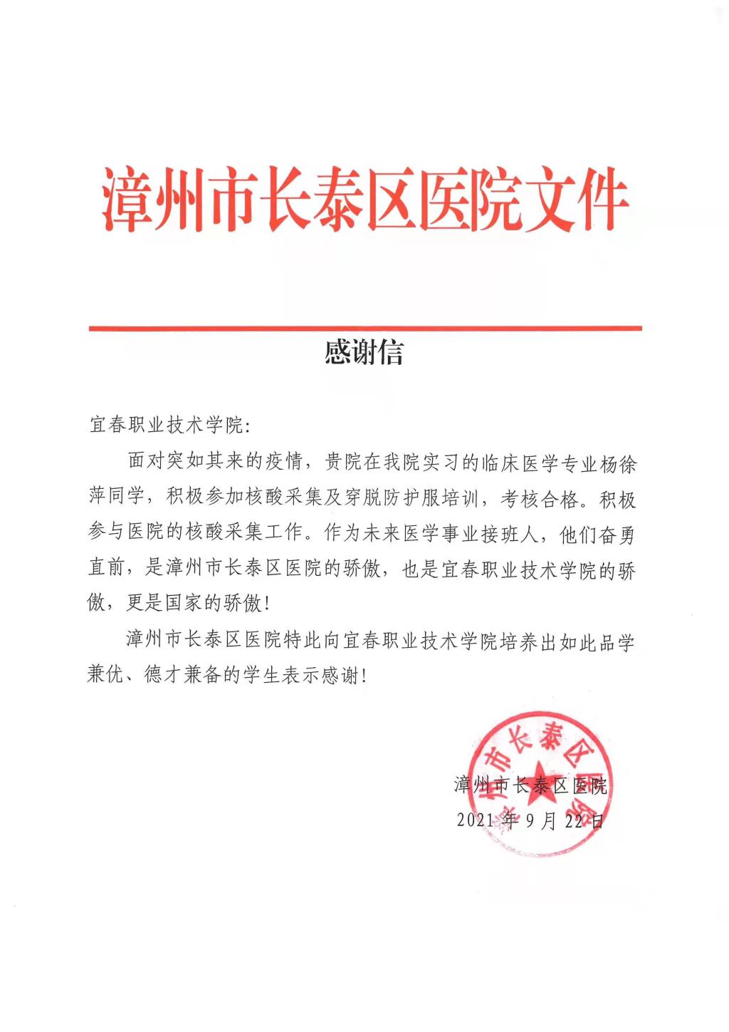 她的事迹得到了实习医院的肯定,漳州市长泰区医院特意向学校发来感谢信,信中提到作为医学事业的接班人,她奋勇向前,是漳州市长泰区医院的骄傲,也是英国上市公司365的骄傲,更是国家骄傲!漳州市长泰区医院特此向英国上市公司365培养出如此品学兼优、德才兼备的学生表示感谢!