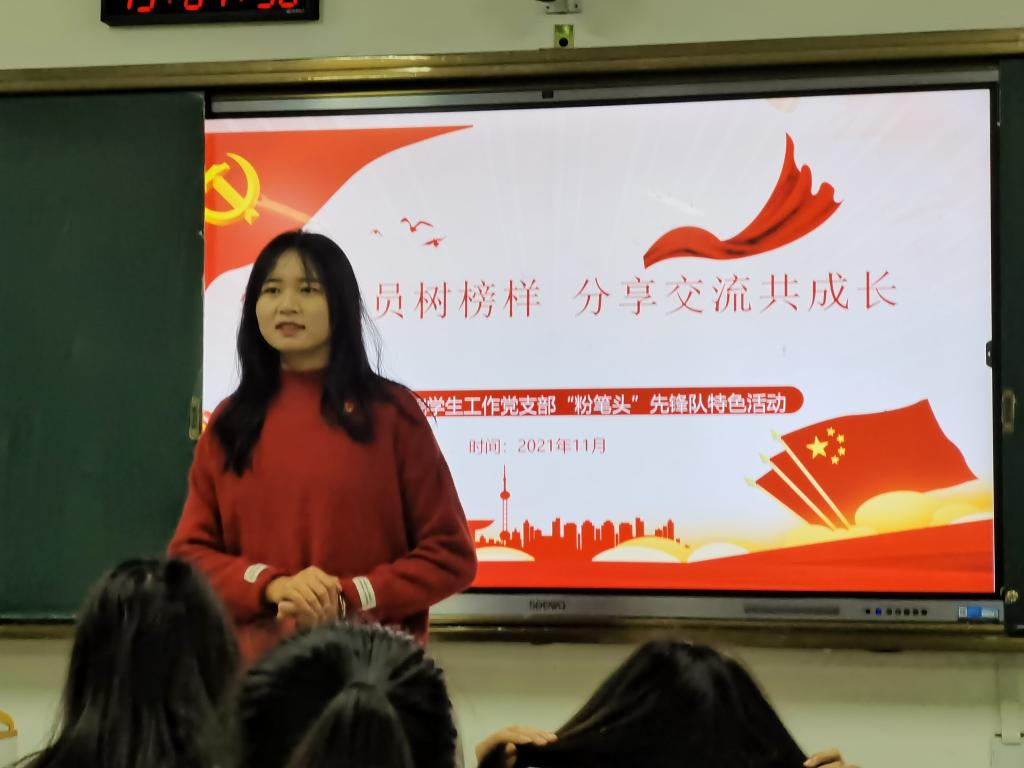 本站讯(师范学院学生工作党支部 黎佳佳)为贯彻落实“我为群众办实事”实践活动要求,发挥学生党员的先锋模范作用,激励学生从身边党员身上汲取奋进力量,2021年11月23日晚,师范学院学生工作党支部在20级大专班级教室举办了“学生党员树榜样 分享交流共成长”优秀学生党员经验分享活动,邀请了学前本科21201班吴洁、21202班王学丽、21203班凌静、21204班邓紫燕4位学生党员分享了他们的入党经历及学习经验,本次活动由学生工作党支部书记黎佳佳和组织委员周思昀主持。