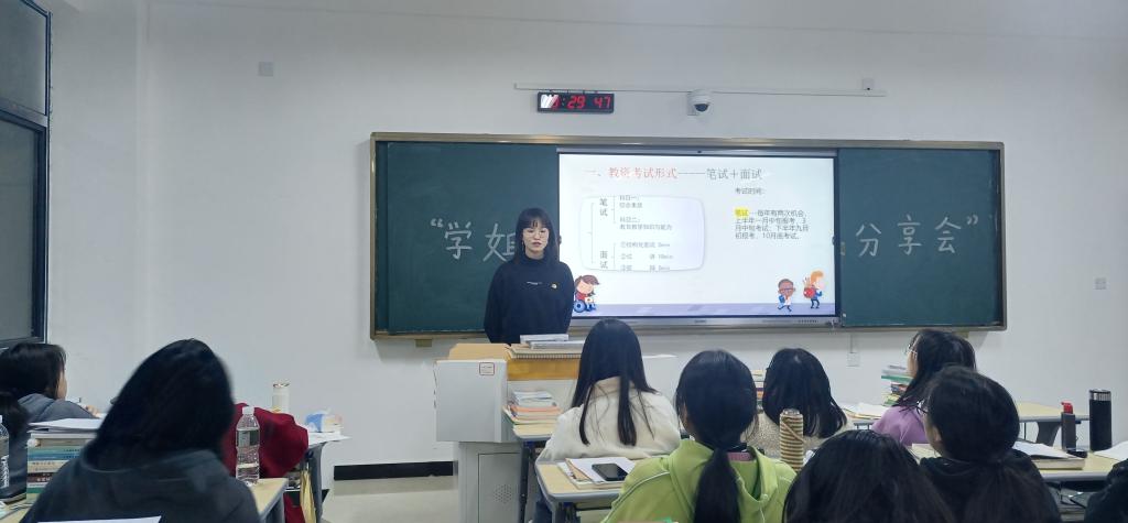 活动中,学生党员吴洁和王学丽结合入党和参加统考专升本的经历分别向小教20301班、20302班和学前20202、20203班的同学们分享了自己入党和专升本的心历路程,从如何递交入党申请书、入党基本阶段、入党以来的思想转变,专升本信息查找、备考、志愿填报等问题为同学们详细讲解了入党和专升本考前准备事项。学生党员凌静和邓紫燕分别为小教20309班、20318班、20314班、20315班分享了关于教师资格证考试的经验,从笔试题型、知识点分布到面试流程、教案模板等细致讲解了教师资格证考试的注意事项,为同学们带来了满满的干货。现场氛围浓厚,同学们认真听取经验做好笔记并不时互动提问,学生党员们为同学积极答疑解惑。
