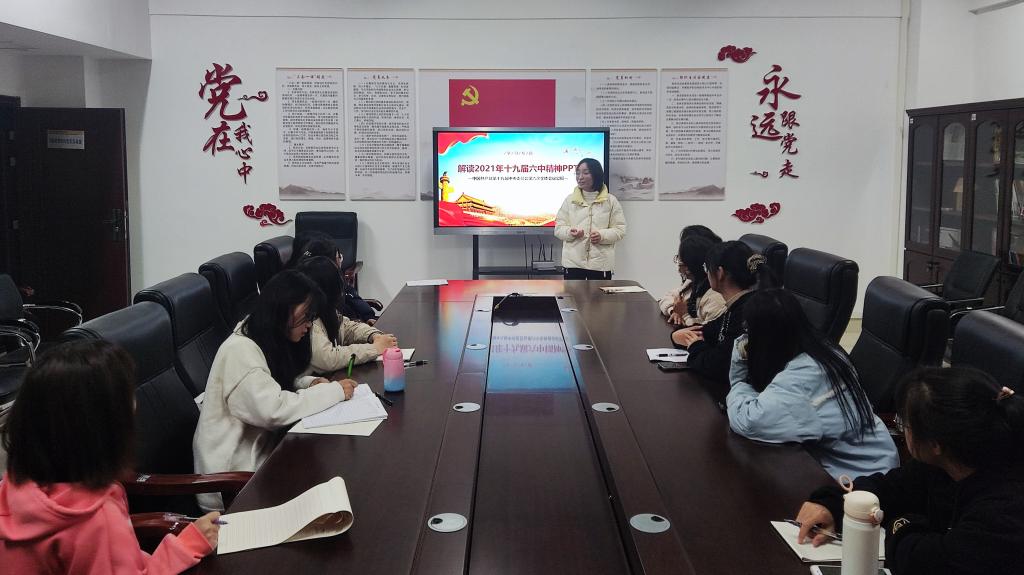 本站讯(国际教育学院 杨琨 学生记者 潘晓)为引导学生深入领会党的十九届六中全会精神,提高思想政治素养,强化青年责任担当,国际教育学院学生工作党支部于11月29日晚上7:00在科技综合楼401党员活动室开展支部挂点班级活动,活动以主题为“学全会精神,做强国青年”的党课形式开展,学生工作党支部党员吴雯老师主讲,国际教育学院入党积极分子以及2021新生班主要班团干部参加。