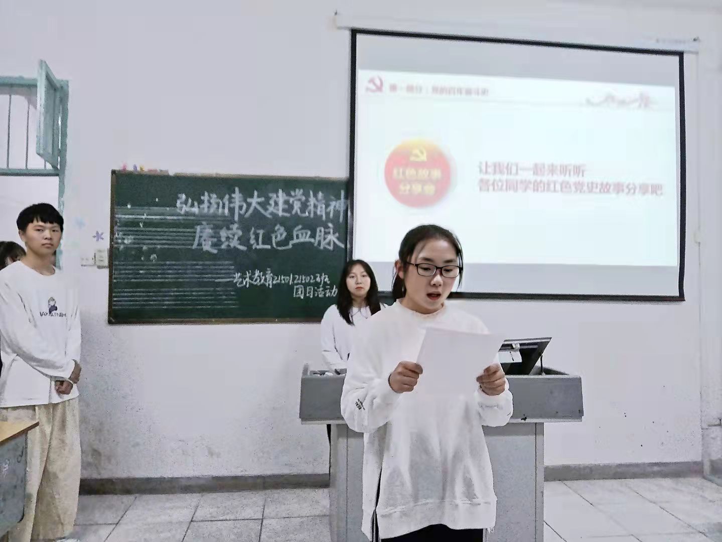 此次团日活动在各班团支书以及主持人带领下隆重举行。装扮着彩色气球,摆放整齐的桌椅很好地营造出了氛围。书画设计班的同学们首先观看了一部红色影片的剪辑片段,让同学感悟到革命来之不易,是他们抛头颅洒热血才换来今天的和平幸福生活。而后团支书又带领同学们党史知识问答小游戏,同学们积极踊跃,台下一片掌声,气氛恰到好处。同学们准备的朗诵将气氛推至高潮,有让人印象深刻的讲解《红岩》中的江姐为了革命事业,十根手指头都被反动派扎了针,不怕牺牲,英勇无畏的例子,和抗日战争打倒小日本的经典桥段,我们拿着“小米加步枪”端了敌人的老巢,迎来了抗日战争的胜利,以及袁隆平的杂交水稻解决了中国人民的温饱问题,邓稼先发明的原子弹为中国国防事业增添一份力,长津湖里冰雕连匍匐在雪地里凝视着敌人的样子浮现在眼前。