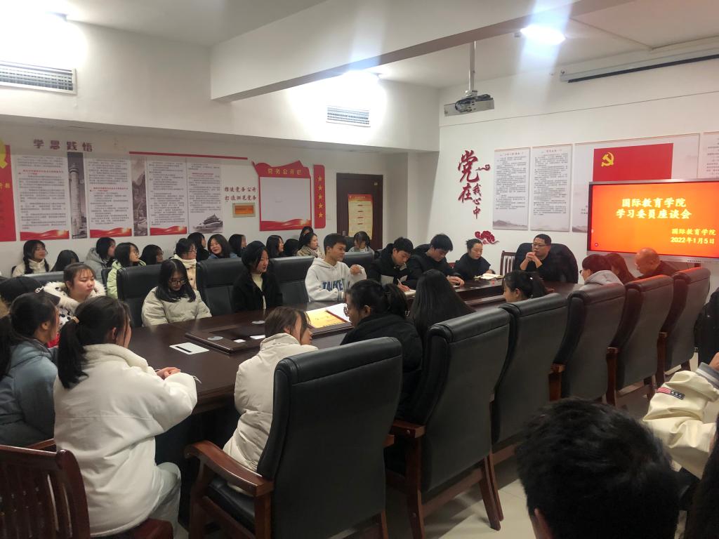 本站讯(国际教育学院 颜灵仪)为更深入掌握我院学生学习效果,促进教学质量稳步提升,国际教育学院于2022年1月5日晚7:00在科技综合楼401召开2021-2022学年第一学期学习委员座谈会,国际教育学院副院长肖勇,小学英语教育专业负责人李强,教务科科长江萍,教务干事颜灵仪及所有在校班级学习委员和学生代表参加会议。