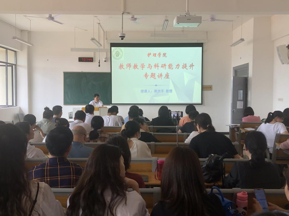本站讯(护理学院 张越)4月26日下午,护理学院在和济楼404教室开展“教师教学与科研能力提升专题讲座”,护理学院全体教师及护理(健康管理)科研团队成员参加。