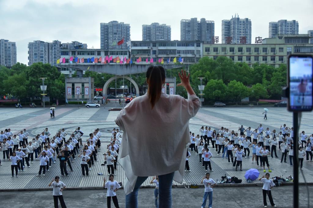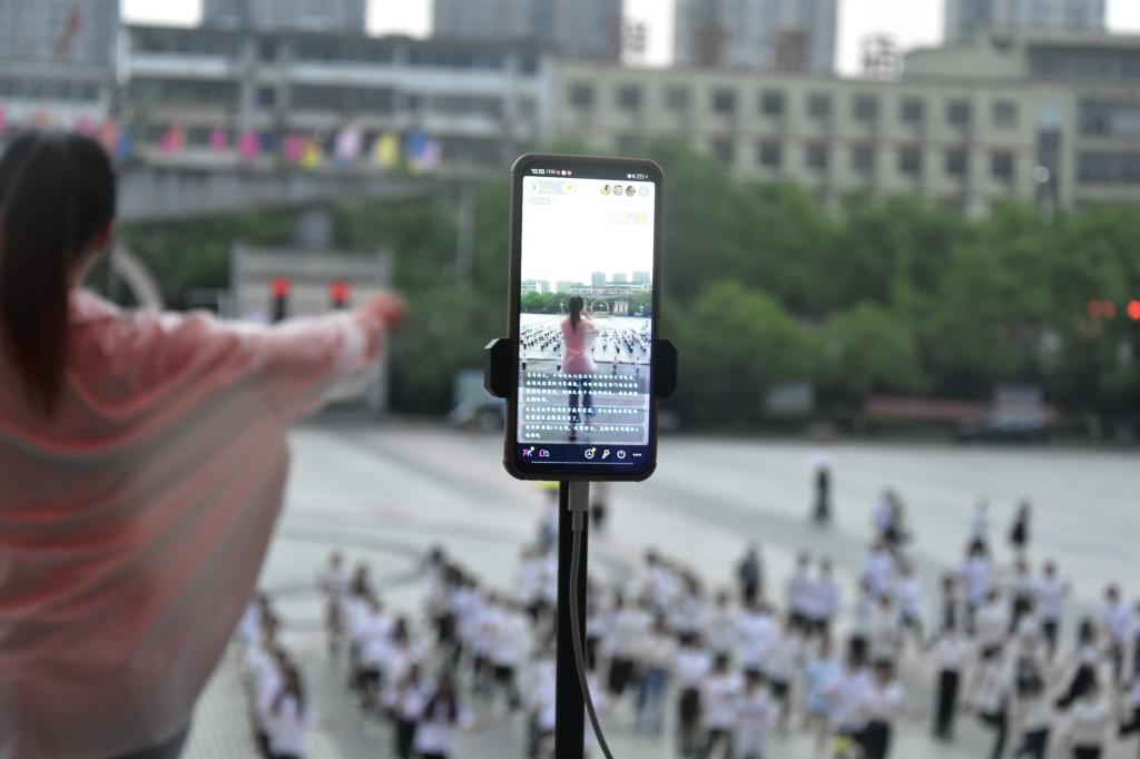 为响应疫情防控工作,此活动分为线上和线下开展。线上由宜职大通社的学生负责通过官抖直播;线下参与活动的学生在工作人员引导下到达指定位置,并保持前后左右间距1米以上。活动伊始,由领舞同学带领大家暖场热身,大家认真仔细,保障身体各关节充分活动开。伴随《本草纲目》动感十足的音乐,学生们纷纷跟着领舞同学起舞,用心怒放,将青春的活力尽情挥洒。温热的太阳洒向每一位活力四射的学生,不一会儿大家的额头上都冒出了一粒粒汗珠,在领舞的同学的带领下,学生们的舞步成了宜职闭环期间最靓丽的一道风景线。