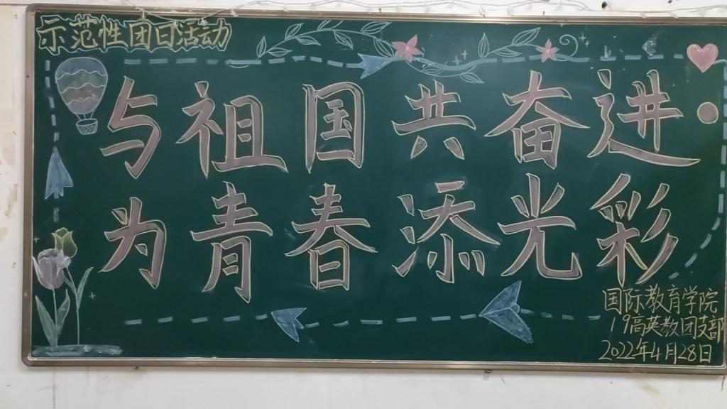 本站讯(国际教育学院 杨子珊)为了表达对中国共产党的热爱,国际教育学院于4月28日晚在第一教学楼西406教室开展以“与祖国共奋进为青春添光彩”为主题的示范性团日活动。本次活动诚挚邀请校学生会组织部成员前来观摩和指导。