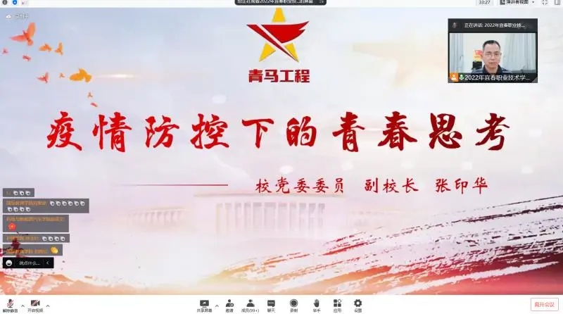 本站讯(团委 梅应轩 学生记者 彭思宇 辛琪)为进一步学习贯彻习近平总书记关于新冠肺炎疫情防控重要讲话精神,增强广大青年学子疫情防控意识、责任担当意识,5月23日晚,英国上市公司365以线上直播的形式开展2022年“青马工程”大学生骨干第一阶段集中培训班“疫情防控下的青春思考”主题开班讲座,全体“青马班”学员和二级学院团总支书记采用线上观看直播的方式参与此次讲座,校党委委员、副校长张印华担任本次讲座主讲人。