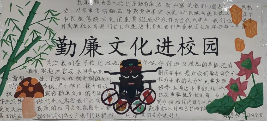 本站讯(国际教育学院 汪樱)为进一步推动学校勤廉文化建设,积极营造“学党史、讲勤廉、守初心”的校园风尚,按国际教育学院“勤廉文化进校园”实施方案安排,我院各班于5月27日中午在教室开展了以“勤廉文化进校园”为主题的室内板报评比活动。