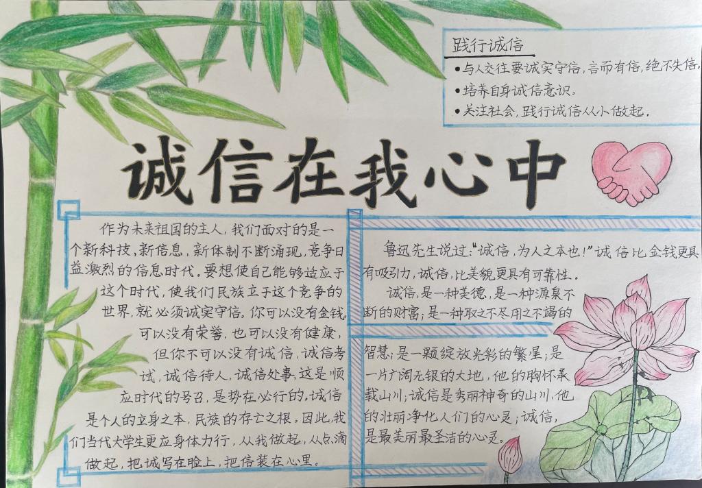 本站讯(国际教育学院 金岩 汪樱)为引导学生树立诚信理念,培养学生“诚信待人,诚信处事,诚信学习,诚信立身”的诚信品质。国际教育学院于2022年5月开展了以“诚信校园行”为主题的手抄报征集活动。