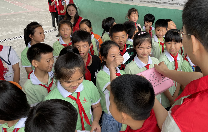实践队伍首先来到柏木乡小学四(1)班,周俊杰老师与志愿者们一起向同学们介绍VR虚拟现实设备及使用方法,同学们感受到了科技带来的沉浸式学习方式,纷纷举手想要体验。接着,刘嘉妮老师向同学们宣讲党史精神,通过党史故事宣讲方式形象地让同学们了解到早年毛泽东遇险时的冷静判断与机智勇敢,更清楚认识到中国社会长期稳定繁荣的来之不易和中国共产党的伟大所在。最后,志愿者们与同学们一起到操场上开展了团结互助的小游戏,并教会乡村小孩《隐形的翅膀》手势舞,每一位孩子天真的眼神从一开始的紧张到后面活动积极参与,学习热情十分高涨。活动结束后,实践队还前往柏木乡的街道上向每一位村民讲解反诈APP的使用,帮助村民树立正确的投资理财观念,提高防金融诈骗意识及分辨能力,为建设美好新时代贡献青春力量。