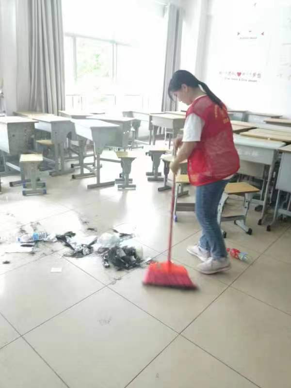 活动期间,志愿者们分组分区域开展劳动服务,有的扫地、有的打水、有的擦桌子,大家充分发扬不怕苦、不怕脏的精神,不放过任何一个卫生死角,各个忙得不亦乐乎。忙碌的身影是最美的,经过几个小时的辛勤劳动,教室变得干净整洁,志愿者们挂满汗水的脸颊也露出了微笑。