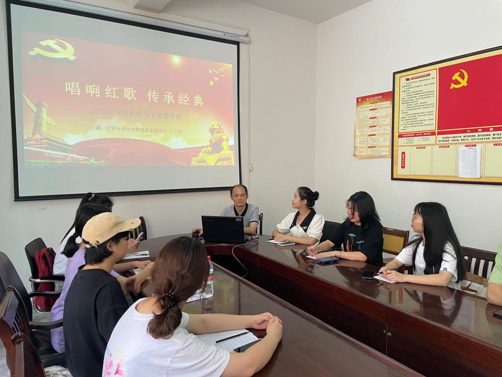 本站讯(艺术与设计学院 吴卿妍)为弘扬中国优秀的传统文化,培养学生的民族精神和爱国精神,让学生了解祖国的历史和成长历程,艺术与设计学院于6月14日午在科技楼会议室开展《唱响红歌,传承经典》党课。本次党课由艺术与设计学院党总支副书记兰七荣担任主讲人为我院入党积极分子讲解了歌唱红歌的重大意义,在于从对红色革命传统的重温中,感受那段热血的红色历史,学习革命先烈的精神。