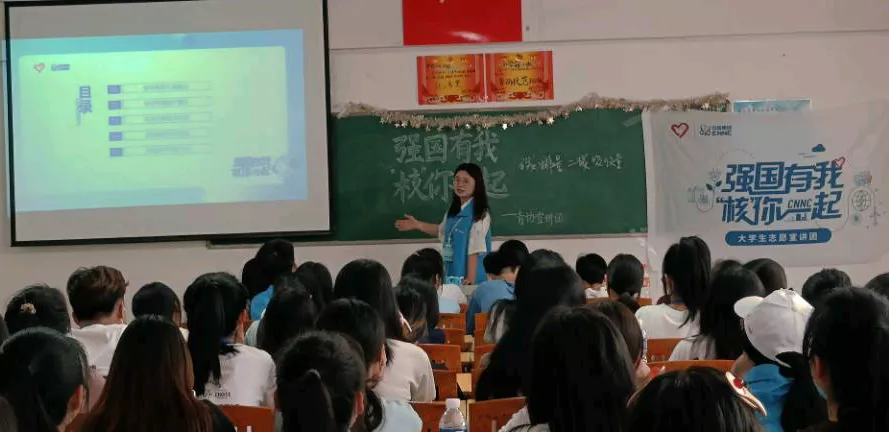 随后,宣讲人程艳飞从发展核电的紧迫性、优越性及主动性三个方面概述了如何助力碳中和目标的实现。接下来的提问环节,让气氛快速活跃起来。程艳飞生动有趣的讲述,让学生们了解到“核”知识,并进一步提高了对核电发展的认知。