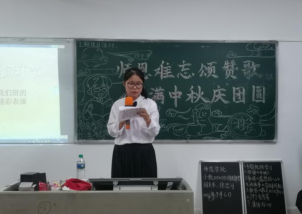 各班团支部精心组织,周密安排,活动于19:30准点开始,小教20502的同学用娓娓动听的歌声拉开了本次活动的序幕,“明月几时有,把酒问青天”,一首澄净而旷达的千古绝唱,豪放兼之婉约,飛逸而又深沉。小教20504的六位同学踩着音乐的节拍翩然起舞,舞姿温柔细腻又不乏力度感,以一舞《追光者》深深表达着对老师的敬佩与尊重,为辛勤的老师们送上了一份诚挚的祝福。小教21501通过讲故事的形式从古人的赏月、拜师讲到现在的对月感怀、师恩深重,话语虽轻,表达的却不仅仅是一份祝福和感恩,更是一颗颗真诚、纯粹的心灵和一份份赤诚、浓烈的热爱。