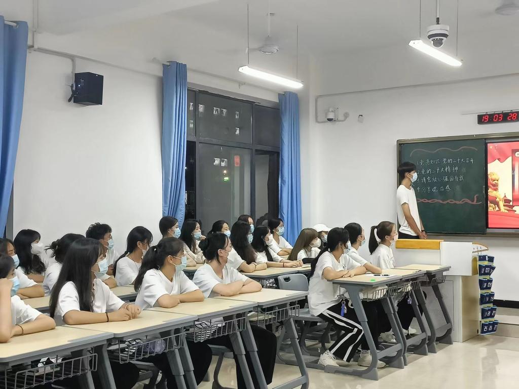各班级同学全程戴好口罩参与活动。活动开展第一项,同学们通过“学习强国”app进入“盛世华诞喜迎二十大 强国有我共筑安全长城”专题中进行视频观看。视频中以习近平同志为核心的党中央关心青年和青年工作纪实,引导同学们深刻领悟习近平总书记重要讲话精神的丰富内涵,不断深化学习贯彻习近平新时代中国特色社会主义思想,树立坚定的理想信念,凝聚起共建美丽新中国的青春力量,营造浓厚的团学氛围。第一项活动结束后,各班级开展自主活动,并井然有序地做好群众性宣讲,通过加强教育培训,深化了理论研究。这不仅加强了思想教育工作,更有利于培养同学的爱国情怀,弘扬长征精神,牢记历史使命,树立坚定理想信念。