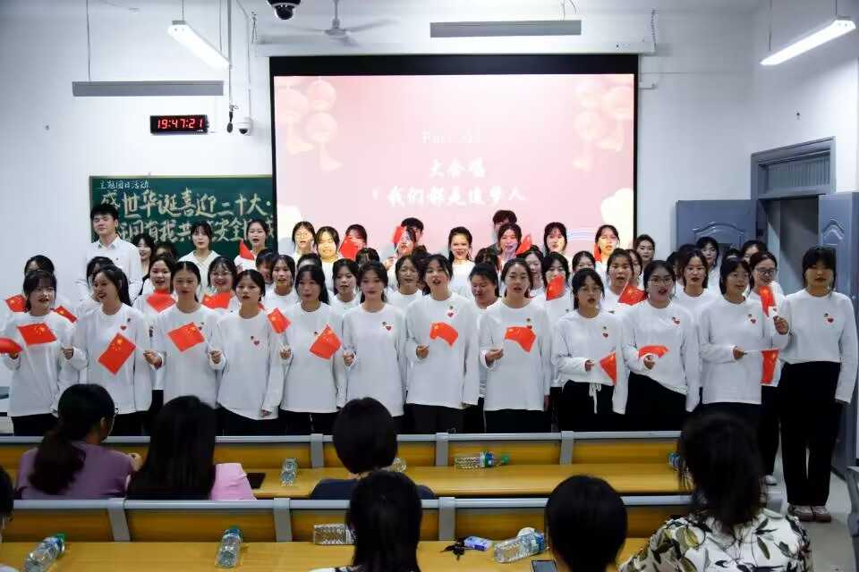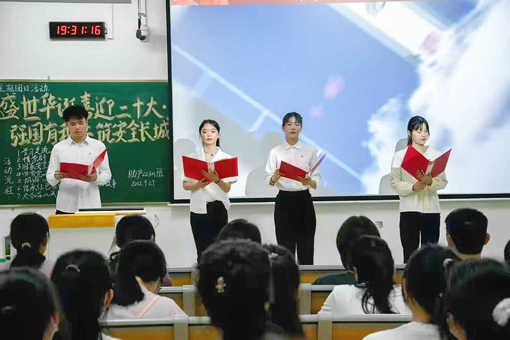 此次的示范性主题团日活动由护理学院助产22301班承担,校团委全体工作人员、各学院团总支书记及各二级学院学生代表现场观摩了此次活动,同时此次示范性主题团日活动也在“宜春职院青年”视频号上进行全程直播,供全校师生观摩学习。活动围绕庆国庆、喜迎党的二十大,坚决捍卫国家安全三个部分灵活开展,以丰富多彩的节目将多个主题融会贯通。同学们通过观看学习强国平台相互交流心得体会,让大家重温了祖国在党领导下的百年奋斗光辉历程。随后,通过生动演绎《国家安全、人人有责》情景剧片段,引导着同学们领会国家安全人人有责、人人可为的深刻内涵,并通过大声朗诵《读中国》,在同学们的心中厚植爱党爱国情怀。活动最后,同学们铿锵有力、激情澎湃地合唱《我们都是追梦人》,表露出青年学子们必将肩负起实现中华民族伟大复兴重大历史使命的决心。活动结束后,校团委书记施旸从前期准备和活动程序上肯定了活动开展效果,活动环节紧凑有序、富有青春朝气,展现出了当代大学生奋发向上的时代风采,同时针对活动细节指出了不足及改进建议。她提出,要始终牢记习近平总书记的殷殷嘱托,希望更多青年学子尽展强国有我,奋进新时代的青春向党之心。