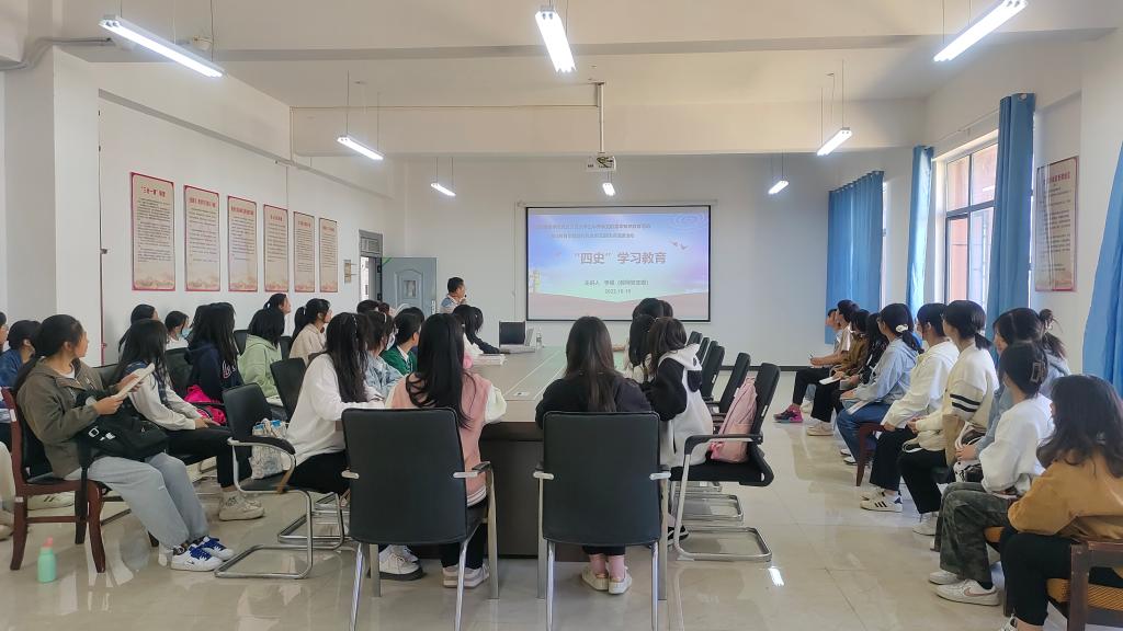 本站讯(国际教育学院 李强 学生记者 严丽)为提高同学们的思想觉悟,培养同学们的爱国主义精神,根据国际教育学院党总支在大学生中开展党的基本知识教育活动方案,10月19日中午,国际教育学院教师党支部在博达楼党员活动室开展了以“四史学习教育”为主题的支部挂点班级活动。此次活动由党员教师李强老师主讲,新生班各班团支书与递交入党申请书同学参与。