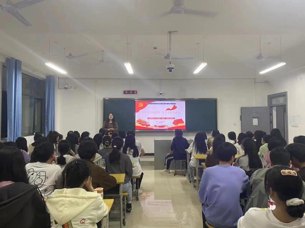 本站讯(师范学院学生工作党支部 杨星)为贯彻落实“我为群众办实事”实践活动要求,发挥学生党员的先锋模范作用,激励学生从身边党员身上汲取奋进力量,10月23日晚,师范学院学生工作党支部在2022级大专班级教室举办了“学生党员树榜样 分享交流共成长”优秀学生党员经验分享活动,邀请了学前本科22201班聂欣雅、22202班孙世宇、22203班郭佳艺3位学生党员分享了他们的入党经历及学习经验,本次活动由学生工作党支部书记杨星和组织委员王婷主持。