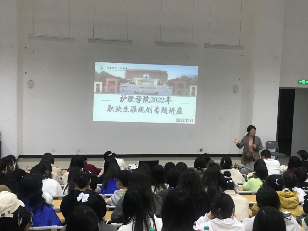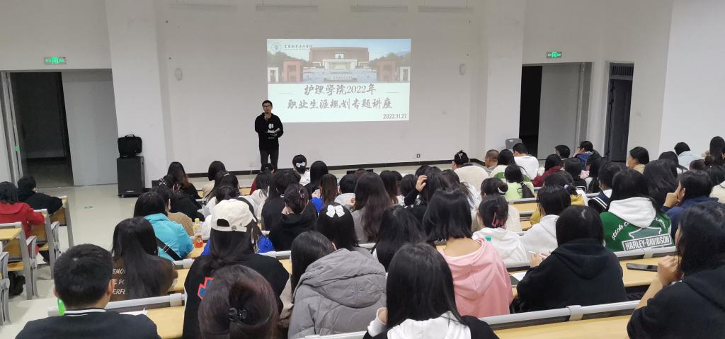 本站讯(护理学院 李辉员)为进一步提升学生职场竞争力,提高专业认知度,合理规划职业生涯,11月27日晚,护理学院在和济楼阶梯教室举办2022年职业生涯规划专题讲座。护理学院党总支书记胡蓉、院领导曲晴、全体实习班班主任及学生代表共计300余人参加,讲座由实习就业科科长李辉员主持。