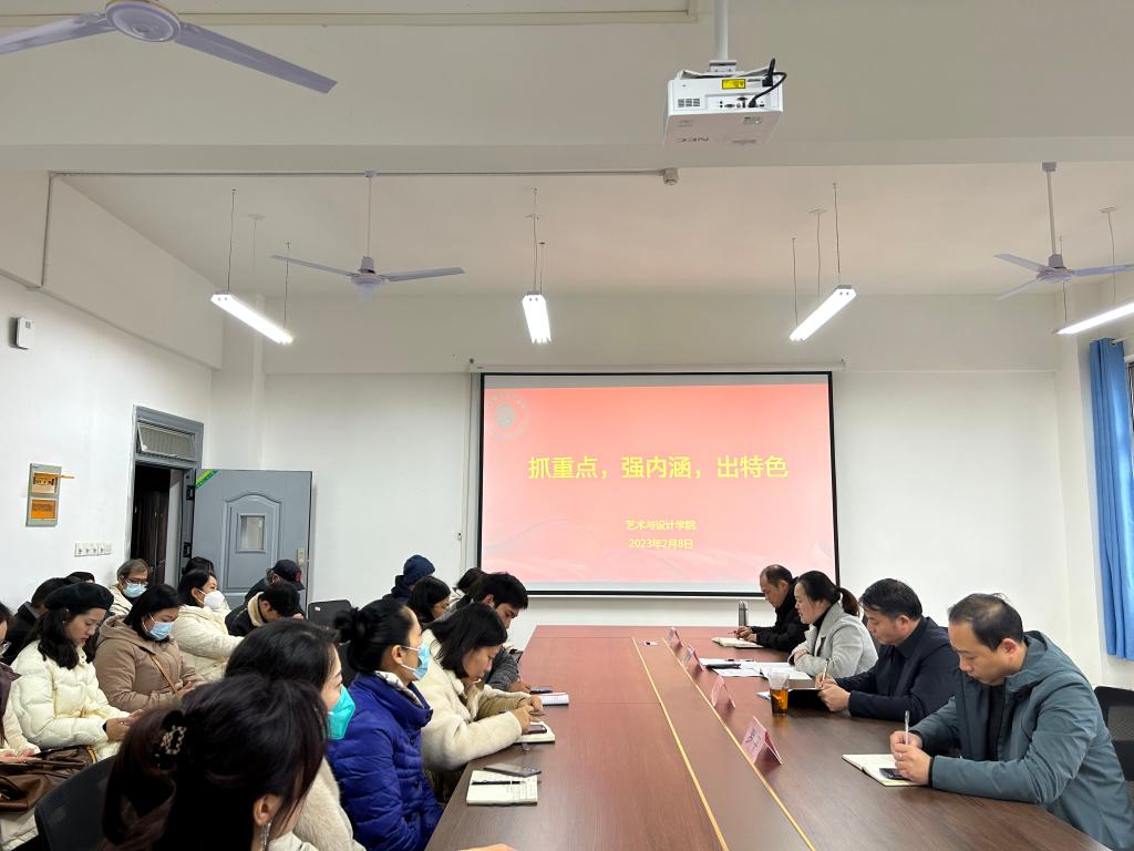 本站讯(艺术与设计学院 吴卿妍)启航兔年新征程,砥砺奋进谋新篇。2月8日下午,艺术与设计学院在博达楼A413召开新学期全体教职工大会。校纪委书记刘平涯、学院领导班子成员、全体教职工参加会议。会上,向与会人员传达学校新学期工作会议精神,安排部署学院本学期的各项工作。