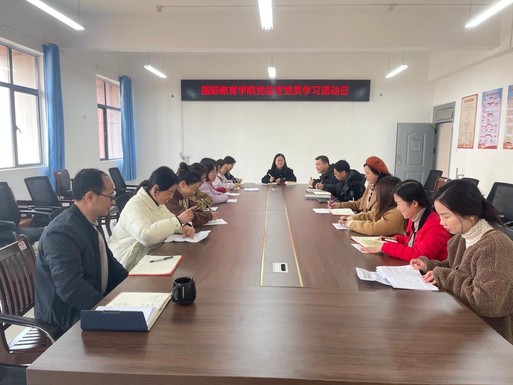 本站讯(国际教育学院 刘洋倩)为深入学习贯彻党的二十大精神和习近平总书记在党的二十届一中全会上的重要讲话精神,全面落实学校“三比三争”工作动员会议部署,2月21日下午,国际教育学院党总支在博达楼党员活动室开展二月份的党员学习活动日活动。活动以学习讨论会的方式开展,由党总支书记刘海云主持。