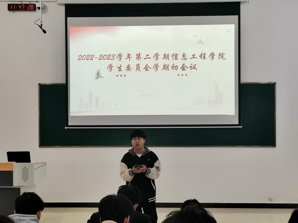 本站讯(信息工程学院 黄彪 学生记者 刘洋)为进一步加强学生会队伍建设,提高学生干部的综合素质,增强思想政治引领实效,2月21日,信息工程学院召开学期初学生会全体例会。会议由学生会执行主席余顺主持。